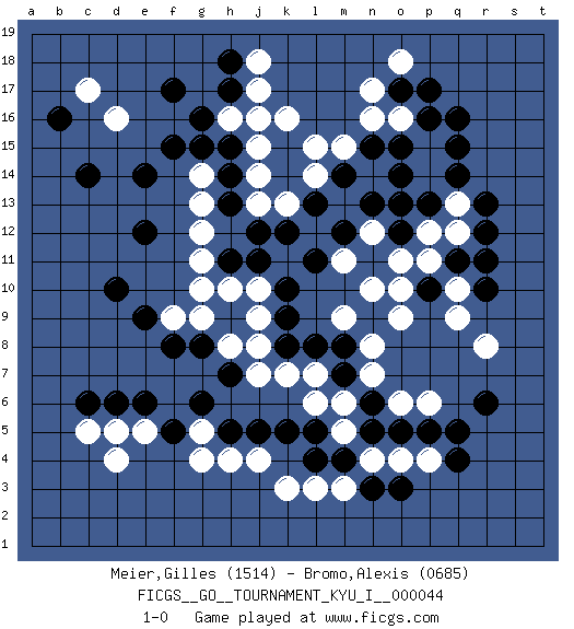 Last move : 1-0 2013 March 16 13:48:7 [Event "FICGS__GO__TOURNAMENT_KYU_I__000044"] [Site "FICGS"] [Date "2013.02.17"] [Round "1"] [Black "Meier,Gilles"] [White "Bromo,Alexis"] [Result "1-0"] [Rating 1 "1514"] [Rating 2 "0685"] 1.q16 d4 2.q4 d16 3.c6 c5 4.d6 d5 5.e6 e5 6.g6 g5 7.c14 k16 8.o17 q10 9.r6 p6 10.o3 n4 11.n3 l3 12.r13 p14 13.q14 p15 14.q15 q13 15.r12 q12 16.r10 r8 17.q11 p11 18.r11 n17 19.p16 o16 20.o15 n16 21.p13 p12 22.o14 o13 23.p10 q9 24.o12 o11 25.n13 n12 26.o13 o10 27.b16 c17 28.h5 h4 29.f5 g4 30.j5 j4 31.m4 m5 32.n5 o4 33.l5 m6 34.o5 p4 35.p5 o6 36.n6 n7 37.q5 m3 38.l4 k3 39.m7 l6 40.k5 l7 41.m8 n8 42.l8 k7 43.k8 j7 44.h7 j8 45.n9 o9 46.n11 n10 47.m12 m9 48.k9 j9 49.k10 m11 50.l11 n12 51.l13 j10 52.j11 h10 53.h11 g10 54.h15 g11 55.h17 h16 56.g16 j16 57.f17 j15 58.h14 j14 59.h13 j13 60.j12 k13 61.k12 l14 62.m14 m15 63.n15 l15 64.e14 j17 65.h18 j18 66.d10 h8 67.g8 g9 68.f8 f9 69.e9 g12 70.e12 g13 71.f15 g14 72.g15 o18 73.p17 1-0 Here are the names of the openings (joseki) played in the four corners : Corner d4 : d4 c6 Hoshi (Hwajeom, Seongjeom, Xingwei`) 4-4 Point. The star or hoshi (4-4) point, emphasizing influence at the potential expense of territory. Ikken Kakari (Hankan Keolch'im, Yi Gua`jiao~, 1-Space Low Approach). Black 2 is the standard approach move to the 4-4. Corner d16 : d16 c14 Hoshi (Hwajeom, Seongjeom, Xingwei`) 4-4 Point. The star or hoshi (4-4) point, emphasizing influence at the potential expense of territory. Ikken Kakari (Hankan Keolch'im, Yi Gua`jiao~, 1-Space Low Approach). Black 2 is the standard approach move to the 4-4. Player Black won this Go (weiqi, baduk) game. Follow this game move after move (download)Balance is not what players strike for, and if it does arise, it is in spite of them. (Pierre Audouard) Methinks King Thibault should dub Marius Zubac a knight of the square board... I mean table, henceforth addressing him as Sir Marius, and bestow on him a suitable land from the kingdom of FICGS & marry him off to a worthy, fair maiden, lest he slice our heads with his mighty sword in his wrath. (Dinesh De Silva)