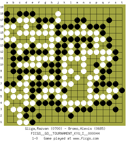 Last move : 1-0 2013 February 20 20:17:3 [Event "FICGS__GO__TOURNAMENT_KYU_I__000044"] [Site "FICGS"] [Date "2013.02.17"] [Round "1"] [Black "Gliga,Razvan"] [White "Bromo,Alexis"] [Result "1-0"] [Rating 1 "0700"] [Rating 2 "0685"] 1.q16 d4 2.q4 d16 3.c9 d7 4.c14 c15 5.d14 d15 6.f16 e15 7.m17 l15 8.k16 n16 9.r13 p14 10.q7 o6 11.m3 k4 12.n14 n13 13.o16 n15 14.o14 o15 15.o13 p13 16.m13 n12 17.l14 o12 18.m14 m15 19.m12 m11 20.k14 k15 21.j15 p15 22.p16 p12 23.l10 l11 24.m10 n11 25.r10 j14 26.j13 h14 27.k12 k11 28.j11 l12 29.k13 h13 30.g12 h12 31.j12 h11 32.j10 k10 33.h10 g11 34.f12 h15 35.j16 h16 36.h17 f15 37.f17 n10 38.l8 l9 39.m9 k9 40.g10 f11 41.e12 e11 42.d11 f10 43.f9 g9 44.h9 g8 45.j8 h8 46.j9 k8 47.j7 l7 48.f8 m8 49.g7 n9 50.d18 d17 51.c18 c17 52.n17 g16 53.g17 k7 54.e9 e10 55.b17 b16 56.a18 b14 57.b13 a15 58.d3 c3 59.c4 c5 60.b4 b3 61.e3 e4 62.f4 b5 63.e5 d5 64.e6 d6 65.h4 j5 66.k3 l4 67.j3 l3 68.l2 m4 69.n3 n4 70.o3 o4 71.p4 p5 72.b7 d10 73.c11 c10 74.g14 g13 75.f14 e14 76.e13 f13 77.b10 d13 78.d12 c13 79.d9 g15 80.b12 c12 81.b11 a14 82.s3 q5 83.r4 r5 84.s5 r6 85.r7 s6 86.d2 c2 87.q15 q14 88.r14 r12 89.s12 r11 90.s11 q12 91.s7 q10 92.q9 p9 93.r9 p8 94.p7 o7 95.h5 j6 96.t6 h6 97.h7 g6 98.f6 g5 99.g4 f5 100.e7 d1 101.e1 c1 102.f2 a4 103.r17 c7 104.a13 a16 105.c8 b6 106.a7 a6 107.p10 q11 108.b9 d8 109.q8 o8 110.l16 e17 111.e18 e8 112.f7 g8 113.a17 l13 114.j4 h8 115.p6 o5 116.m16 j18 117.k6 k5 118.pass j17 119.pass 1-0 Here are the names of the openings (joseki) played in the four corners : Corner d4 : d4 c9 Hoshi (Hwajeom, Seongjeom, Xingwei`) 4-4 Point. The star or hoshi (4-4) point, emphasizing influence at the potential expense of territory. Corner d16 : d16 c14 Hoshi (Hwajeom, Seongjeom, Xingwei`) 4-4 Point. The star or hoshi (4-4) point, emphasizing influence at the potential expense of territory. Ikken Kakari (Hankan Keolch'im, Yi Gua`jiao~, 1-Space Low Approach). Black 2 is the standard approach move to the 4-4. Player Black won this Go (weiqi, baduk) game. Follow this game move after move (download)Go is to western chess what philosophy is to double entry accounting. (from Shibumi, by Trevanian) A journey of a thousand sites begins with a single click. (Author unknown)