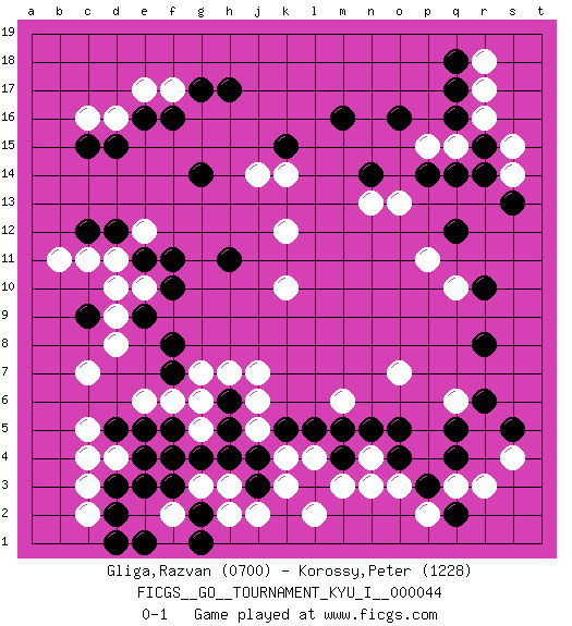 Last move : 0-1 2013 June 18 12:8:4 [Event "FICGS__GO__TOURNAMENT_KYU_I__000044"] [Site "FICGS"] [Date "2013.02.17"] [Round "1"] [Black "Gliga,Razvan"] [White "Korossy,Peter"] [Result "0-1"] [Rating 1 "0700"] [Rating 2 "1228"] 1.q16 d16 2.q4 d4 3.c9 c7 4.c15 c11 5.d12 d11 6.e11 d9 7.e9 d8 8.d15 c16 9.e16 e17 10.f16 f17 11.r8 k4 12.h17 e12 13.c12 e10 14.f11 b11 15.f3 h3 16.f5 o3 17.q12 k10 18.m16 r17 19.q17 r16 20.r15 s15 21.r14 s14 22.s13 q15 23.q14 p15 24.o16 n13 25.q18 r18 26.d3 c3 27.d2 c2 28.d5 c5 29.e4 c4 30.h5 j6 31.h11 k12 32.g2 h2 33.o5 o7 34.m4 n4 35.n5 m3 36.l5 m6 37.m5 q6 38.f10 d10 39.o4 n3 40.l3 l2 41.p3 l4 42.n14 o13 43.g17 k14 44.k15 j14 45.g14 q10 46.p14 p11 47.r10 r3 48.r6 p2 49.q2 q3 50.q5 s4 51.s5 g7 52.h6 h7 53.g4 e6 54.f7 f6 55.f8 g6 56.e5 e2 57.e1 f1 58.d1 g5 59.h4 f2 60.g1 g3 61.e3 f2 62.j3 j2 63.j4 k3 64.k5 j5 65.f4 j7 0-1 Here are the names of the openings (joseki) played in the four corners : Corner d4 : d4 c9 Hoshi (Hwajeom, Seongjeom, Xingwei`) 4-4 Point. The star or hoshi (4-4) point, emphasizing influence at the potential expense of territory. Corner d16 : d16 c15 Hoshi (Hwajeom, Seongjeom, Xingwei`) 4-4 Point. The star or hoshi (4-4) point, emphasizing influence at the potential expense of territory. Player White won this Go (weiqi, baduk) game. Follow this game move after move (download)In the corner, five stones in a row on the third line are alive. (Anonymous) There are two major products that came out of Berkeley: LSD and UNIX. We do not believe this is to be a coincidence. (Jeremy S. Anderson)
