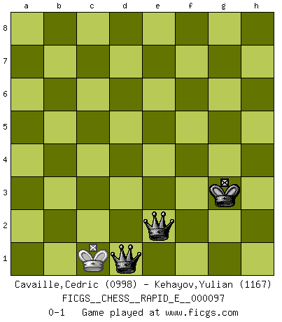 Last move : 0-1 2013 February 22 21:39:44 [Event "FICGS__CHESS__RAPID_E__000097"] [Site "FICGS"] [Date "2013.02.20"] [Round "1"] [White "Cavaille,Cedric"] [Black "Kehayov,Yulian"] [Result "0-1"] [WhiteElo "0998"] [BlackElo "1167"] 1.d4 Nf6 2.c4 c5 3.Nf3 cxd4 4.Nxd4 Nc6 5.Nc3 e6 6.e4 Qa5 7.Be2 Nxe4 8.Nxc6 dxc6 9.Qc2 Bb4 10.Bd2 Nxc3 11.Bxc3 O-O 12.O-O Bxc3 13.Qxc3 Qxc3 14.bxc3 c5 15.Rfd1 e5 16.Rd5 Bf5 17.Rxe5 Rfe8 18.Rxe8+ Rxe8 19.Bf3 b6 20.g4 Bd3 21.Rc1 Bxc4 22.a3 h6 23.Rd1 Re7 24.h4 g6 25.Kg2 Kg7 26.Bd5 Rd7 27.Bf3 Rxd1 28.Bxd1 b5 29.f4 f6 30.Bc2 a5 31.Kf3 Bd5+ 32.Be4 Bb3 33.Ke3 b4 34.cxb4 cxb4 35.axb4 axb4 36.Kd2 Ba2 37.Kc2 Kf7 38.f5 gxf5 39.gxf5 Ke7 40.Kb2 b3 41.Bd5 Kd6 42.Bxb3 Bxb3 43.Kxb3 Ke5 44.Kc3 Kxf5 45.Kd3 Kf4 46.Kd4 Kf3 47.Kd5 Kg4 48.Ke4 f5+ 49.Ke3 Kxh4 50.Kf3 Kg5 51.Kg3 h5 52.Kh3 f4 53.Kg2 h4 54.Kh3 f3 55.Kh2 Kg4 56.Kg1 h3 57.Kh1 Kg3 58.Kg1 f2+ 59.Kf1 h2 60.Ke2 h1Q 61.Ke3 f1Q 62.Kd2 Qh1f3 63.Kc2 Qf1d3+ 64.Kb2 Qf3e2+ 65.Kc1 Qd3d1+ 0-1 Benoni defense Kingside Castling by player Black (move 11) Kingside Castling by player White (move 12) 10 pieces endgame at move 38 : White KBPP , Black KBPPPP WHITE : King + 1 Bishop 2 Pawns BLACK : King + 1 Bishop 4 Pawns 9 pieces endgame at move 39 : White KBPP , Black KBPPP WHITE : King + 1 Bishop 2 Pawns BLACK : King + 1 Bishop 3 Pawns 8 pieces endgame at move 42 : White KBPP , Black KBPP WHITE : King + 1 Bishop 2 Pawns BLACK : King + 1 Bishop 2 Pawns 7 pieces endgame at move 42 : White KPP , Black KBPP WHITE : King + 2 Pawns BLACK : King + 1 Bishop 2 Pawns 6 pieces endgame at move 43 : White KPP , Black KPP WHITE : King + 2 Pawns BLACK : King + 2 Pawns 5 pieces endgame at move 44 : White KP , Black KPP WHITE : King + 1 Pawn BLACK : King + 2 Pawns 4 pieces endgame at move 49 : White K , Black KPP WHITE : King + BLACK : King + 2 Pawns Promotion Queen by player Black (move 60) Promotion Queen by player Black (move 61) Player Black won this chess game. Follow this game move after move (download)When the Chess game is over, the Pawn and the King go back to the same box. (Irish saying) Der Schachmeister von Heute braucht Courage, einen Killerinstinkt, Ausdauer und Arroganz. (Larry Evans) Repentinamente, me resultaba obvio en mi analisis que yo había pasado por alto lo que Fischer había visto en el tablero con la mas grande facilidad. (Mikhail Botvinnik) Soyez une menace à chaque fois que vous vous asseyez pour jouer. (Ken Smith) Life is painting a picture, not doing a sum. (Oliver Wendell Holmes, Jr.)