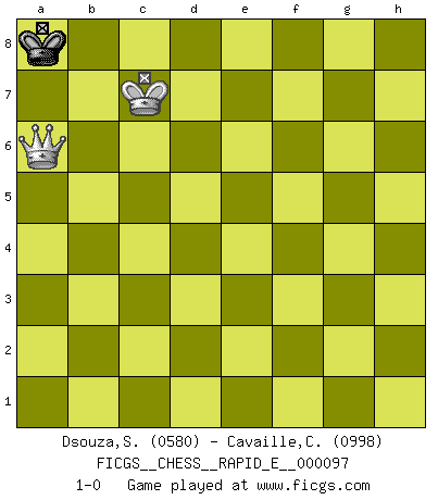 Last move : 1-0 2013 March 25 20:26:39 [Event "FICGS__CHESS__RAPID_E__000097"] [Site "FICGS"] [Date "2013.02.20"] [Round "1"] [White "Dsouza,Stanislaus"] [Black "Cavaille,Cedric"] [Result "1-0"] [WhiteElo "0580"] [BlackElo "0998"] 1.e4 c5 2.Nf3 d6 3.d4 cxd4 4.Nxd4 Nf6 5.Bd3 e6 6.O-O Be7 7.Nc3 O-O 8.Be3 Bd7 9.h3 Nc6 10.f4 a6 11.a3 b5 12.Rc1 Qb6 13.Be2 Nxd4 14.Bxd4 Qb7 15.Bf3 Bc6 16.e5 Nd5 17.Nxd5 Bxd5 18.Be3 Bxf3 19.Rxf3 d5 20.Kh2 a5 21.Bd4 b4 22.axb4 Qxb4 23.Rb3 Qc4 24.Qd3 Qxd3 25.Rxd3 a4 26.c4 dxc4 27.Rxc4 Rfb8 28.Rc7 Kf8 29.Bc3 a3 30.bxa3 Rxa3 31.R3d7 Re8 32.Be1 Ra4 33.Bg3 Ra5 34.Ra7 Rxa7 35.Rxa7 f5 36.Bf2 Kf7 37.g4 h6 38.gxf5 exf5 39.Bc5 Ke6 40.Rxe7+ Rxe7 41.Bxe7 Kxe7 42.h4 Ke6 43.Kg3 g6 44.h5 gxh5 45.Kh4 Kf7 46.Kxh5 Kg7 47.Kh4 Kg6 48.Kh3 h5 49.Kh4 Kh6 50.e6 Kg6 51.e7 Kf7 52.e8Q+ Kxe8 53.Kxh5 Kf7 54.Kg5 Ke6 55.Kg6 Kd5 56.Kxf5 Kd4 57.Kf6 Ke4 58.f5 Kd5 59.Kf7 Kd6 60.f6 Kd7 61.Kf8 Kd8 62.f7 Kd7 63.Kg7 Ke7 64.f8Q+ Ke6 65.Qf4 Kd5 66.Kf7 Kc6 67.Qe5 Kd7 68.Qf6 Kc7 69.Ke7 Kb7 70.Qd6 Kc8 71.Qc6+ Kb8 72.Kd7 Ka7 73.Qb5 Ka8 74.Kc8 Ka7 75.Kc7 Ka8 76.Qa6+ 1-0 Sicilian Kingside Castling by player White (move 6) Kingside Castling by player Black (move 7) 10 pieces endgame at move 40 : White KBPPP , Black KRPPP WHITE : King + 1 Bishop 3 Pawns BLACK : King + 1 Rook 3 Pawns 9 pieces endgame at move 41 : White KBPPP , Black KPPP WHITE : King + 1 Bishop 3 Pawns BLACK : King + 3 Pawns 8 pieces endgame at move 41 : White KPPP , Black KPPP WHITE : King + 3 Pawns BLACK : King + 3 Pawns 7 pieces endgame at move 44 : White KPP , Black KPPP WHITE : King + 2 Pawns BLACK : King + 3 Pawns 6 pieces endgame at move 46 : White KPP , Black KPP WHITE : King + 2 Pawns BLACK : King + 2 Pawns Promotion Queen by player White (move 52) 5 pieces endgame at move 52 : White KP , Black KPP WHITE : King + 1 Pawn BLACK : King + 2 Pawns 4 pieces endgame at move 53 : White KP , Black KP WHITE : King + 1 Pawn BLACK : King + 1 Pawn 3 pieces endgame at move 56 : White KP , Black K WHITE : King + 1 Pawn BLACK : King + Promotion Queen by player White (move 64) Player White won this chess game. Follow this game move after move (download)What is the difference between chess and football? Everybody understands football, but nobody plays it. Everybody plays chess, but nobody understands it. Everything is relative. (Vladimir Kramnik) Wenn Capablanka heute auf der Schachbühne erscheinen würde, hätte er ein halbes Jahr gebraucht um sich die Schachtheorie anzueignen. Und dann hätte er alles und jeden besiegt. (Mikhail Moiseyevich Botvinik) Hay dos clases de hombres: aquellos que se conforman en dejarse llevar por las circunstancias y que juegan barajas y aquellos decididos a controlar las circunstancias y que juegan al Ajedrez. (Mortimer Collins) Roi des jeux et jeu des rois, les échecs portent en eux un sentiment d'infini. Ils donnent à celui qui s'est efforcé d'en approfondir les arcanes l'impression de n'être pas à la mesure de l'homme; en fait, ils constituent un résumé de l'univers, un microcosme, et figurent cette grande échelle qui, dans les plans de la lumière descend jusqu'à la matière, qui des abîmes insondables remonte jusqu'en l'infini de Dieu. (Pyrame) We cannot be sure of having something to live for unless we are willing to die for it. (Ernesto Che Guevara)