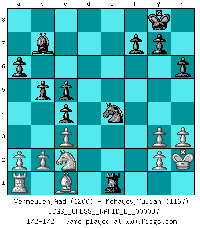 Last move : 1/2-1/2 2013 March 18 20:20:18 [Event "FICGS__CHESS__RAPID_E__000097"] [Site "FICGS"] [Date "2013.02.20"] [Round "1"] [White "Vermeulen,Aad"] [Black "Kehayov,Yulian"] [Result "1/2-1/2"] [WhiteElo "1200"] [BlackElo "1167"] 1.e4 e5 2.Nf3 Nc6 3.Bb5 Nf6 4.O-O a6 5.Bxc6 dxc6 6.Re1 Bd6 7.d3 h6 8.h3 O-O 9.Nbd2 b5 10.Nf1 Re8 11.Ng3 c5 12.c3 c4 13.d4 exd4 14.Nxd4 Bxg3 15.fxg3 Nxe4 16.Qf3 Bb7 17.Qg4 Nf6 18.Rxe8+ Qxe8 19.Qe2 Qxe2 20.Nxe2 Re8 21.Nd4 c5 22.Nc2 Re2 23.Ne3 Ne4 24.Kh2 Re1 25.Nc2 Re2 26.Ne3 Re1 27.Nc2 1/2-1/2 Ruy Lopez : Berlin defense, 4.O-O Kingside Castling by player White (move 4) Kingside Castling by player Black (move 8) This chess game ended in a draw. Follow this game move after move (download)One doesn't have to play well, it's enough to play better than your opponent. (Siegbert Tarrasch) Den Ruhm habe ich schon, jetzt brauche ich noch das Geld. (Wilhelm Steinitz) Bobby Fischer es el jugador de Ajedrez mas grande que jamás haya existido. (Ken Smith) On peut tirer plus d'utilité d'une partie perdue que de 100 parties gagnées. (Capablanca) The real danger is not that computers will begin to think like men, but that men will begin to think like computers. (Sydney J. Harris)