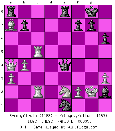 Last move : 0-1 2013 February 22 21:30:9 [Event "FICGS__CHESS__RAPID_E__000097"] [Site "FICGS"] [Date "2013.02.20"] [Round "1"] [White "Bromo,Alexis"] [Black "Kehayov,Yulian"] [Result "0-1"] [WhiteElo "1182"] [BlackElo "1167"] 1.d4 Nf6 2.c4 e6 3.Nc3 d5 4.Nf3 Nc6 5.e3 Bd7 6.a3 Bd6 7.b4 dxc4 8.Bxc4 O-O 9.h3 h6 10.Bb2 Re8 11.O-O e5 12.d5 Ne7 13.e4 c6 14.Ne2 cxd5 15.exd5 Nexd5 16.Bxd5 Qb6 17.Bc1 Bc6 18.Be3 Qc7 19.Qb3 Bxd5 20.Qa4 Bxf3 21.gxf3 e4 22.fxe4 Nxe4 23.Bxa7 Nd2 24.Rfc1 Bh2+ 25.Kg2 Qe5 26.Ra2 Nf3 27.Rc5 Qe4 28.Rac2 Ne1+ 0-1 Queen's pawn game Kingside Castling by player Black (move 8) Kingside Castling by player White (move 11) Player Black won this chess game. Follow this game move after move (download)Chess is a terrible game. If you have no center, your opponent has a freer position. If you do have a center, then you really have something to worry about ! (Siegbert Tarrasch) Wenn ich einen Club besuche, sind die Spieler stumm vor Staunen. (José Raúl Capablanca) El Ajedrez es la vida. (Bobby Fischer) Aux échecs, les retours au sommet sont rares : les dommages psychologiques consécutifs à une défaite sont trop sévères. (Daily Telegraph) The existence of forgetting has never been proved: We only know that some things don't come to mind when we want them. (Friedrich Nietzsche)