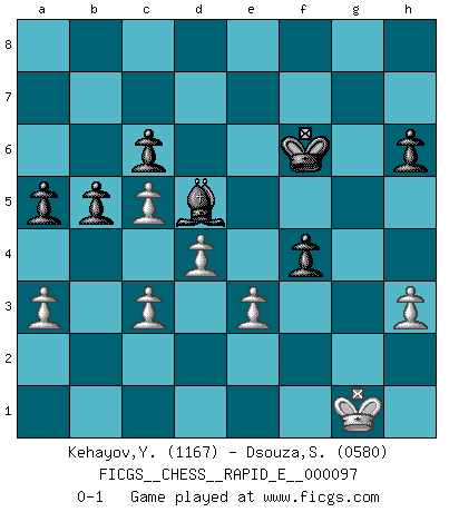 Last move : 0-1 2013 March 16 13:24:22 [Event "FICGS__CHESS__RAPID_E__000097"] [Site "FICGS"] [Date "2013.02.20"] [Round "1"] [White "Kehayov,Yulian"] [Black "Dsouza,Stanislaus"] [Result "0-1"] [WhiteElo "1167"] [BlackElo "0580"] 1.Nc3 e5 2.Nf3 d5 3.Nxe5 Be6 4.Nf3 Bb4 5.d4 Nf6 6.Bd2 Bxc3 7.Bxc3 O-O 8.e3 Ne4 9.Bd3 Nxc3 10.bxc3 h6 11.O-O Nd7 12.Qe2 Nf6 13.c4 c6 14.c5 Ng4 15.h3 Nf6 16.Nh4 Ne4 17.Bxe4 dxe4 18.f3 Qxh4 19.fxe4 Qxe4 20.c3 b5 21.Rf4 Qg6 22.a3 Rae8 23.Re1 Bd5 24.Qg4 Qxg4 25.Rxg4 Re6 26.Kf2 Rfe8 27.Rg3 Rf6+ 28.Kg1 Re4 29.Rf1 Rxf1+ 30.Kxf1 Re6 31.Ke2 Rg6 32.Kf2 Rxg3 33.Kxg3 f5 34.Kf2 a5 35.Kg1 Kf7 36.g3 g5 37.Kf2 Kf6 38.Kg1 f4 39.gxf4 gxf4 0-1 Dunst (Sleipner-Heinrichsen) Opening Kingside Castling by player Black (move 7) Kingside Castling by player White (move 11) Player Black won this chess game. Follow this game move after move (download)Bobby Fischer's current state of mind is indeed a tragedy. One of the world's greatest Chess players - the pride and sorrow of American Chess. (Frank Brady) Dein Körper muss in Topform sein. Dein Schach verfällt, wenn dein Körper verfällt. Der Körper kann nicht vom Geist getrennt werden. (Robert James Fischer) Todo se encuentra en un estado de flujo y esto incluye al mundo del Ajedrez. (Mikhail Botvinnik) Les ravages du H expliquent la différence de niveau entre Tal et Thal [Abergel]. Drag your thoughts away from your troubles... by the ears, by the heels, or any other way you can manage it. (Mark Twain)