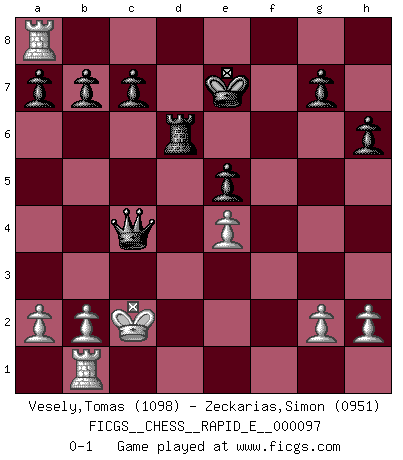 Last move : 0-1 2013 March 28 20:40:41 [Event "FICGS__CHESS__RAPID_E__000097"] [Site "FICGS"] [Date "2013.02.20"] [Round "1"] [White "Vesely,Tomas"] [Black "Zeckarias,Simon"] [Result "0-1"] [WhiteElo "1098"] [BlackElo "0951"] 1.e4 e5 2.Nf3 Nf6 3.d4 exd4 4.Qxd4 Nc6 5.Qe3 Qe7 6.Bc4 Qb4+ 7.Nbd2 Ng4 8.Qf4 d6 9.Qxf7+ Kd8 10.Ng5 h6 11.Ne6+ Bxe6 12.Bxe6 Nge5 13.Qf5 Be7 14.f4 Bh4+ 15.Ke2 Nd4+ 16.Kf1 Nxf5 17.fxe5 Ne3+ 18.Ke2 Nxc2 19.Rb1 Nd4+ 20.Ke3 Bg5+ 21.Kd3 dxe5 22.Nc4 Re8 23.Bd2 Bxd2 24.Nxd2 Rxe6 25.Rhf1 Qb5+ 26.Nc4 Nc2 27.Rf8+ Ke7 28.Rxa8 Rd6+ 29.Kc3 Qb4+ 30.Kxc2 Qxc4+ 0-1 Petrov : Modern (Steinitz) attack Player Black won this chess game. Follow this game move after move (download)Chess is a foolish expedient for making idle people believe they are doing something very clever when they are only wasting their time. (George Bernard Shaw) Das Schach hält seine Meister in eigenen Banden, Fesseln; auf vielerlei Weise formt es ihren Geist, so dass die innere Freiheit selbst des Stärksten beeinflusst wird. (Albert Einstein) La caracteristica mas importante en la posición del Ajedrez es la actividad de las piezas. Esto es absolutamente fundamental en todas las fases del juego: Apertura, Juego Medio y especialmente Finales. La limitación primordial en la actividad de una pieza, es la estructuración de los Peones. (Michael Stean) Il n'y a pas de prix trop élevé au scalp de l'ennemi. (Koblentz) I find your interest interesting. (Gregory House, House M.D.)
