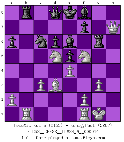 Last move : 1-0 2007 March 21 4:53:14 [Event "FICGS__CHESS__CLASS_A__000014"] [Site "FICGS"] [Date "2007.01.26"] [Round "1"] [White "Pecotic,Kuzma"] [Black "Konig,Paul"] [Result "1-0"] [WhiteElo "2163"] [BlackElo "2287"] 1.e4 c5 2.Nf3 Nc6 3.d4 cxd4 4.Nxd4 Nf6 5.Nc3 e5 6.Ndb5 d6 7.Bg5 a6 8.Na3 b5 9.Bxf6 gxf6 10.Nd5 Be7 11.c3 f5 12.Bd3 Be6 13.Qh5 f4 14.Nc2 Rg8 15.g3 fxg3 16.hxg3 Rg7 17.Nce3 b4 18.Nf5 Rg6 19.Qxh7 bxc3 20.bxc3 Bf8 21.Rb1 Rb8 22.O-O 1-0 Sicilian : Pelikan (Lasker/Sveshnikov) variation Kingside Castling by player White (move 22) Player White won this chess game. Follow this game move after move (download)If one piece is badly posted, the whole game is bad. (Tarrasch) Frage: Was machen Sie mit den Preisen? Anwort: Ich habe Angst, dass meine Freundin davon neue Kleider kauft. (Loek van Wely) Puntos débiles o agujeros en la posición de tu oponente deben de ser ocupados por piezas, no Peones. (Siegbert Tarrasch) Je fais ceci parce que dans cinquante coups j'obtiendrai cela; je m'appelle Mikhail Moisevitch Botvinnik. (Botvinnik) A government big enough to give you everything you want is strong enough to take everything you have. (Thomas Jefferson)