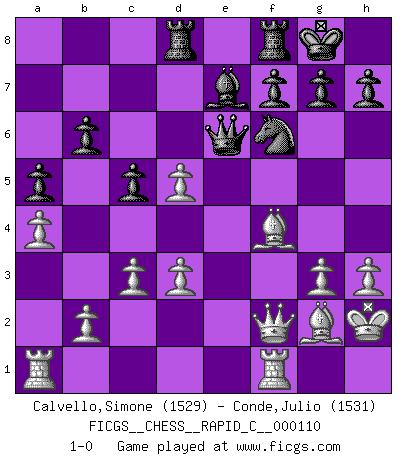 Last move : 1-0 2013 April 21 15:32:11 [Event "FICGS__CHESS__RAPID_C__000110"] [Site "FICGS"] [Date "2013.02.21"] [Round "1"] [White "Calvello,Simone"] [Black "Conde,Julio"] [Result "1-0"] [WhiteElo "1529"] [BlackElo "1531"] 1.e4 c5 2.Nc3 Nc6 3.g3 Nf6 4.Bg2 e5 5.d3 d6 6.f4 Bg4 7.Nce2 Nd4 8.c3 Nxe2 9.Nxe2 Be7 10.h3 Bxe2 11.Qxe2 Qc7 12.O-O O-O 13.Qf2 Rad8 14.Be3 b6 15.a4 a5 16.Kh2 d5 17.fxe5 Qxe5 18.Bf4 Qe6 19.exd5 1-0 Sicilian : Closed Kingside Castling by player White (move 12) Kingside Castling by player Black (move 12) Player White won this chess game. Follow this game move after move (download)Adequate compensation for a sacrifice is having a sound combination leading to a winning position; adequate compensation for a blunder is having your opponent snatch defeat from the jaws of victory. (Bruce A. Moon) Ich kenne keine einzige Person, die behaupten würde, Garri Kasparow sei ein guter Mensch (Nigel Short) Un jugador que es sorprendido, esta derrotado a medias. (Proverbio) Tout change constamment, y compris dans le monde des Echecs. (Botvinnik) The ultimate in disposing one's troops is to be without ascertainable shape. Then the most penetrating spies cannot pry in nor can the wise lay plans against you. (Sun Tzu)