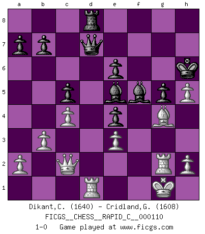 Last move : 1-0 2013 May 5 21:50:54 [Event "FICGS__CHESS__RAPID_C__000110"] [Site "FICGS"] [Date "2013.02.21"] [Round "1"] [White "Dikant,Christophe"] [Black "Cridland,Graham"] [Result "1-0"] [WhiteElo "1640"] [BlackElo "1608"] 1.d4 Nf6 2.Nf3 g6 3.e3 Bg7 4.Be2 O-O 5.b3 c5 6.Bb2 Ne4 7.O-O Nc6 8.c3 d5 9.Nbd2 Bf5 10.Nxe4 dxe4 11.Ne1 Qc7 12.Qc2 h5 13.d5 Ne5 14.c4 Rad8 15.Rd1 Bf6 16.Bxe5 Bxe5 17.g3 h4 18.Ng2 hxg3 19.fxg3 Kg7 20.Nf4 Rh8 21.Rd2 Rh7 22.Bd1 Rdh8 23.g4 g5 24.Nh5+ Rxh5 25.gxh5 Qd7 26.Rdf2 e6 27.dxe6 fxe6 28.Rg2 Kh6 29.Bg4 Rd8 30.Rd1 1-0 King's Indian : East Indian defense Kingside Castling by player Black (move 4) Kingside Castling by player White (move 7) Player White won this chess game. Follow this game move after move (download)The boy (then a 12 year old boy named Anatoly Karpov) doesn't have a clue about Chess, and there's no future at all for him in this profession. (Mikhail Botvinnik) Ihnen, Herr Lasker, habe ich nur drei Worte zu sagen: Schach und matt. (Siegbert Tarrasch) El Ajedrez es un regaderazo frío para la mente. (Sir John Simon) Même un GMI sait rarement calculer sur plus de cinq coups une attaque à sacrifices. (Rudolf Spielmann) A good book on your shelf is a friend that turns its back on you and remains a friend. (Author unknown)