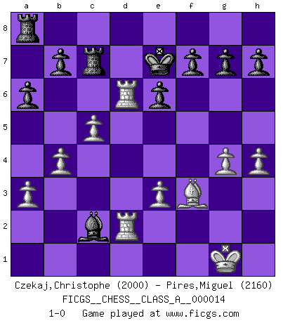 Last move : 1-0 2007 September 4 7:6:34 [Event "FICGS__CHESS__CLASS_A__000014"] [Site "FICGS"] [Date "2007.01.26"] [Round "1"] [White "Czekaj,Christophe"] [Black "Pires,Miguel"] [Result "1-0"] [WhiteElo "2000"] [BlackElo "2160"] 1.e4 d5 2.exd5 Nf6 3.Nf3 Bg4 4.Bb5+ Nbd7 5.h3 Bh5 6.Nc3 a6 7.Be2 Nb6 8.d4 Nbxd5 9.Nxd5 Qxd5 10.c4 Qd6 11.O-O e6 12.Be3 Be7 13.g4 Bg6 14.Ne5 Qb4 15.Bf3 Rd8 16.Qc1 c6 17.a3 Qb6 18.h4 c5 19.dxc5 Bxc5 20.b4 Bxe3 21.Qxe3 Qxe3 22.fxe3 Nd7 23.Nxd7 Rxd7 24.Rfd1 Rc7 25.c5 Ke7 26.Rd6 Ra8 27.Rad1 Bc2 28.R1d2 1-0 This chess game has been lost on time (started : 2007.01.26 16:40:4) Scandinavian defense Kingside Castling by player White (move 11) Player White won this chess game. Follow this game move after move (download)If I win a tournament, I win it by myself. I do the playing. Nobody helps me. (Bobby Fischer) Ein guter Spieler hat immer Glück. (José Raúl Capablanca) Me dio la sensación de como si yo estuviera jugando en contra del mismo Ajedrez. - al estar jugando en contra de Robert Fischer (Walter Shipman) Je crois qu'il existe des manières très spécifiques de jouer efficacement contre une machine. Evidemment, nous n'avons aucune chance en technique pure, parce que l'ordinateur calcule de manière parfaite. Mais lorsque nous faisons appel à notre cerveau, en utilisant l'intuition et la compréhension, alors nous restons beaucoup plus forts. (Anatoli Karpov) My poor ole parrot... Is not in the circulation of displays ....poo hoo hoo :) (Wayne Lowrance's enigma)