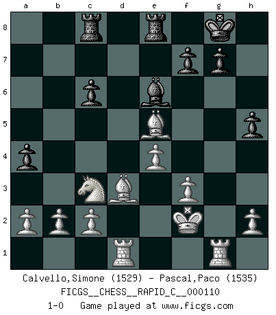 Last move : 1-0 2013 May 11 22:28:31 [Event "FICGS__CHESS__RAPID_C__000110"] [Site "FICGS"] [Date "2013.02.21"] [Round "1"] [White "Calvello,Simone"] [Black "Pascal,Paco"] [Result "1-0"] [WhiteElo "1529"] [BlackElo "1535"] 1.e4 e5 2.Nf3 d6 3.d4 Nc6 4.dxe5 dxe5 5.Qxd8+ Nxd8 6.Nxe5 Be6 7.Nc3 Bc5 8.Bd3 Nf6 9.O-O Bd4 10.Nf3 Ng4 11.Nxd4 O-O 12.Bf4 Nc6 13.Nxc6 bxc6 14.Bxc7 Rfe8 15.f3 Ne3 16.Rfe1 Nxg2 17.Kxg2 a5 18.Rad1 a4 19.Rg1 h5 20.Kf2 Rac8 21.Be5 1-0 This chess game has been lost on time (started : 2013.02.21 18:3:16) Philidor's defense Kingside Castling by player White (move 9) Kingside Castling by player Black (move 11) Player White won this chess game. Follow this game move after move (download)Combinations have always been the most intriguing aspect of Chess. The masters look for them, the public applauds them, the critics praise them. It is because combinations are possible that Chess is more than a lifeless mathematical exercise. They are the poetry of the game; they are to Chess what melody is to music. They represent the triumph of mind over matter. (Reuben Fine) Schach ist wie eine schöne Frau, zu der wir ständig zurückkehren, gleichviel, wie oft sie uns zurückweist. (Anonymous) Botvinnik trató de alejar el misterio referente al Ajedrez, siempre relacionandolo a situaciones de la vida diaria. Solía llamar al Ajedrez un problema inexacto típico, similar a aquellos en que la gente tiene siempre que resolver a cada día. (Garry Kasparov) Je ne suis pas le dernier à jouer lâchement des coups douteux pendant le zeïtnot de l'adversaire pour l'achever: en effet les coups qui font le plus peur sont ceux que l'on ne comprend pas. Je me fais souvent peur quand je joue. (Un professeur anonyme) Memory is a way of holding onto the things you love, the things you are, the things you never want to lose. (from the television show: The Wonder Years)