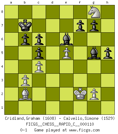 Last move : 0-1 2013 June 17 17:10:18 [Event "FICGS__CHESS__RAPID_C__000110"] [Site "FICGS"] [Date "2013.02.21"] [Round "1"] [White "Cridland,Graham"] [Black "Calvello,Simone"] [Result "0-1"] [WhiteElo "1608"] [BlackElo "1529"] 1.e4 e5 2.Nf3 Nc6 3.Bb5 Nf6 4.O-O Nxe4 5.d4 Nd6 6.Bxc6 dxc6 7.dxe5 Nf5 8.Qxd8+ Kxd8 9.Nc3 Bd7 10.b3 b6 11.Bb2 Kc8 12.h3 h5 13.Ng5 Be8 14.Nce4 Be7 15.Rfe1 Rh6 16.Rad1 Rg6 17.Nf3 Kb7 18.Nd4 Nxd4 19.Bxd4 c5 20.Bb2 Rd8 21.c4 Rxd1 22.Rxd1 Bc6 23.Re1 a5 24.f3 a4 25.Re3 axb3 26.axb3 Bd7 27.Nc3 Bxh3 28.Re2 Bf5 29.Nd5 Bg5 30.f4 Bh4 31.Ne3 Bd7 32.Nd5 Rg3 33.Re3 c6 34.Rxg3 Bxg3 35.Ne7 Bxf4 36.Kf2 Bg5 37.Ng8 Be6 0-1 Ruy Lopez : Berlin defense, Open variation Kingside Castling by player White (move 4) Player Black won this chess game. Follow this game move after move (download)Though most people love to look at the games of the great attacking masters, some of the most successful players in history have been the quiet positional players. They slowly grind you down by taking away your space, tying up your pieces, and leaving you with virtually nothing to do ! (Yasser Seirawan) Wenn du nicht weißt was du tun sollst, warte bis dein Gegner eine Idee hat. Sie wird sicher schlecht sein. (Siegbert Tarrasch) No hay precio que no valga la pena por la cabellera del Rey enemigo. (Koblentz) Aux échecs, l'amour-propre est satisfait quand on remporte la victoire, mais il n'y a pas de honte à être battu. (Benjamin Franklin) You think that education is too expensive ? Try ignorance. (Derek Bok)