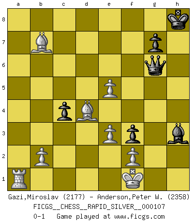 Last move : 0-1 2013 July 1 8:0:32 [Event "FICGS__CHESS__RAPID_SILVER__000107"] [Site "FICGS"] [Date "2013.02.21"] [Round "2"] [White "Gazi,Miroslav"] [Black "Anderson,Peter W."] [Result "0-1"] [WhiteElo "2177"] [BlackElo "2358"] 1.d4 d5 2.Nf3 e6 3.c4 c6 4.Qc2 Nf6 5.g3 dxc4 6.Qxc4 b5 7.Qd3 Bb7 8.Bg2 a6 9.O-O c5 10.Bf4 c4 11.Qc2 Nbd7 12.Nc3 Be7 13.a3 O-O 14.Rad1 Nd5 15.Nxd5 exd5 16.Ne5 Re8 17.Qf5 Nf6 18.Rfe1 h6 19.Bd2 a5 20.a4 Qb6 21.axb5 Qxb5 22.Bc3 a4 23.Rb1 Bc8 24.Qf4 Bd6 25.h3 Be6 26.g4 Qb7 27.Qd2 Ne4 28.Qc2 Rac8 29.Qxa4 f6 30.Nf3 h5 31.Nd2 hxg4 32.Nxe4 dxe4 33.hxg4 Bxg4 34.Ra1 Qf7 35.Kf1 Qg6 36.Qb5 Kh7 37.Ra5 Bh2 38.e3 Re5 39.Qb7 Rb8 40.Rxe5 Rxb7 41.Bxe4 f5 42.Bxb7 Bxe5 43.dxe5 f4 44.Bd4 f3 45.Rc1 Kh8 46.Ra1 Bh3+ 0-1 Peter W. Anderson Thanks for the game Miroslav. Queen's pawn game Kingside Castling by player White (move 9) Kingside Castling by player Black (move 13) Player Black won this chess game. Follow this game move after move (download)My style is somewhere between that of Tal and Petrosian. (Reshevsky) Die Partien sind immer verschieden, die Interviews immer die gleichen. (Garry Kasparov) Cuando tu casa esta en llamas, no puedes ser molestado por tus vecinos. O, como decinos en Ajedrez, si tu Rey esta bajo ataque, no te preocupa perder un Peón del lado de la Reina. (Gary Kasparov) Si je n'étais pas joueur d'échecs, je serais le meilleur dans quelque chose d'autre. (Anatoli Karpov) You can think I'm wrong, but that's no reason to quit thinking. (Gregory House, House M.D.)