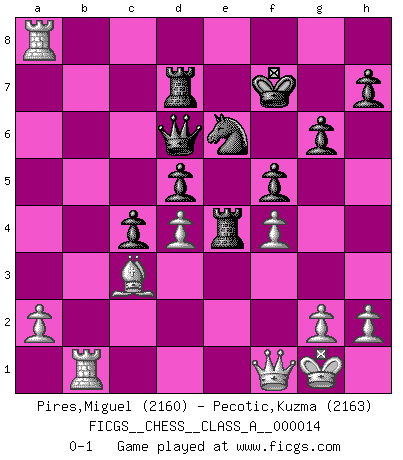 Last move : 0-1 2007 September 16 14:43:2 [Event "FICGS__CHESS__CLASS_A__000014"] [Site "FICGS"] [Date "2007.01.26"] [Round "1"] [White "Pires,Miguel"] [Black "Pecotic,Kuzma"] [Result "0-1"] [WhiteElo "2160"] [BlackElo "2163"] 1.e4 e5 2.Bb5 c6 3.Ba4 Nf6 4.Nc3 b5 5.Bb3 b4 6.Na4 Nxe4 7.Nf3 d5 8.d3 Nf6 9.Nxe5 Bd6 10.f4 O-O 11.O-O Qc7 12.d4 Re8 13.c3 bxc3 14.Nxc3 Na6 15.Ba4 Bb7 16.Be3 Qb6 17.Rf3 Re7 18.Rc1 Rae8 19.Bc2 Bc8 20.Na4 Qb7 21.Bd2 c5 22.Rb3 Qc7 23.Rb5 Bd7 24.Ra5 Qb7 25.Nxd7 Nxd7 26.Nc3 Nc7 27.Qf3 g6 28.Rd1 Qxb2 29.Bb3 c4 30.Ba4 Bb4 31.Rxa7 Bxc3 32.Qxc3 Qb6 33.Ra5 Rb8 34.Bxd7 Rxd7 35.Be1 f5 36.Qf3 Re8 37.Bc3 Re4 38.Qf1 Ne6 39.Ra8+ Kf7 40.Rb1 Qd6 0-1 This chess game has been lost on time (started : 2007.01.26 16:40:4) King's pawn game Kingside Castling by player Black (move 10) Kingside Castling by player White (move 11) Player Black won this chess game. Follow this game move after move (download)Combinations have always been the most intriguing aspect of Chess. The masters look for them, the public applauds them, the critics praise them. It is because combinations are possible that Chess is more than a lifeless mathematical exercise. They are the poetry of the game; they are to Chess what melody is to music. They represent the triumph of mind over matter. (Reuben Fine) Du musst nicht gut spielen, es reicht, wenn du besser spielst als dein Gegner. (Anonymous) Todos los Maestros de Ajedrez fueron un día unos principiantes. (Chernev) Ce n'est pas pour s'amuser qu'il joue aux échecs : il célèbre un culte. (Vladimir Nabokov) If you are good, you will be assigned all the work. If you are really good, you will get out of it. (Dan Rotaru)