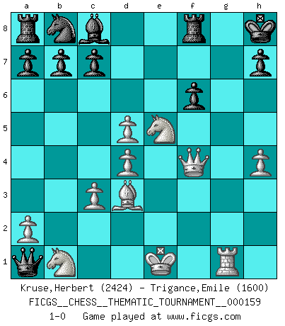 Last move : 1-0 2013 March 4 19:55:55 [Event "FICGS__CHESS__THEMATIC_TOURNAMENT__000159"] [Site "FICGS"] [Date "2013.02.23"] [Round "1"] [White "Kruse,Herbert"] [Black "Trigance,Emile"] [Result "1-0"] [WhiteElo "2424"] [BlackElo "1600"] 1.e4 e5 2.f4 exf4 3.Nf3 g5 4.h4 g4 5.Ne5 Nf6 6.Bc4 d5 7.exd5 Bd6 8.d4 O-O 9.Bxf4 Nh5 10.g3 f6 11.Nxg4 Nxf4 12.gxf4 Bxf4 13.Qf3 Qe7+ 14.Ne5 Qb4+ 15.c3 Qxb2 16.Qxf4 Qxa1 17.Rg1+ Kh8 18.Bd3 1-0 KGA : Kieseritsky, Berlin defense, 6.Bc4 Kingside Castling by player Black (move 8) Player White won this chess game. Follow this game move after move (download)A chess genius has died; a loss for humanity. (Viktor Kortchnoi, about Bobby Fischer's death) In Buenos Aires ist es nicht mein vorrangiges Ziel ein starkes Turnier zu organisieren, sondern ein Turnier für Gentlemen. Ich würde nie Kamsky einladen. Ich mag keine Probleme. (Miguel Najdorf) Una victoria por una combinación errónea, aunque sea espectacular, me llena de horror artístico. (Wilhelm Steinitz) Les échecs, c'est la lutte contre l'erreur. (Johannes Zukertort) A shortcut is the longest distance between two points. (Don Groves)
