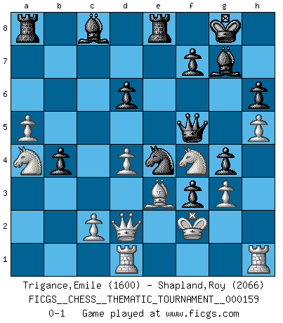 Last move : 0-1 2013 April 15 18:11:3 [Event "FICGS__CHESS__THEMATIC_TOURNAMENT__000159"] [Site "FICGS"] [Date "2013.02.23"] [Round "1"] [White "Trigance,Emile"] [Black "Shapland,Roy"] [Result "0-1"] [WhiteElo "1600"] [BlackElo "2066"] 1.e4 e5 2.f4 exf4 3.Nf3 d6 4.d4 g5 5.h4 g4 6.Ng1 Bh6 7.Ne2 Qf6 8.Nbc3 c6 9.g3 f3 10.Nf4 Qe7 11.Kf2 Nf6 12.Bd3 Bg7 13.Be3 Nbd7 14.Qd2 O-O 15.h5 h6 16.Nd1 Nxe4+ 17.Bxe4 Qxe4 18.Nc3 Qf5 19.b3 Re8 20.Rad1 Nf6 21.a4 b5 22.axb5 cxb5 23.b4 a5 24.bxa5 b4 25.Na4 Ne4+ 0-1 KGA : Fischer defense Kingside Castling by player Black (move 14) Player Black won this chess game. Follow this game move after move (download)When you don't know what to play, wait for an idea to come into your opponent's mind. You may be sure that idea will be wrong. (Siegbert Tarrasch) Es gibt nur zwei wahre Schachgenies - das andere war Wilhelm Steinitz, der Weltmeister von 1872 bis 1894. (Robert James Fischer) Fischer era un maestro de claridad y un Rey del posicionamiento astuto. Sus oponentes podían ver hacia donde se dirigía pero eran impotentes para detenerlo. (Bruce Pandolfini) Il n'y a pas de prix trop élevé au scalp de l'ennemi. (Koblentz) Difficult things take a long time, impossible things a little longer. (Author unknown)
