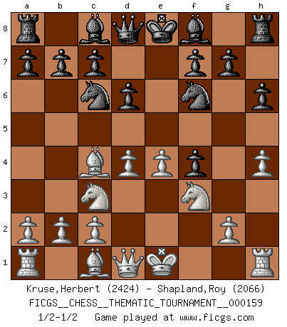 Last move : 1/2-1/2 2013 March 14 19:25:5 [Event "FICGS__CHESS__THEMATIC_TOURNAMENT__000159"] [Site "FICGS"] [Date "2013.02.23"] [Round "1"] [White "Kruse,Herbert"] [Black "Shapland,Roy"] [Result "1/2-1/2"] [WhiteElo "2424"] [BlackElo "2066"] 1.e4 e5 2.f4 exf4 3.Nf3 d6 4.Bc4 h6 5.h4 Nf6 6.Nc3 Nc6 7.d4 1/2-1/2 KGA : Fischer defense This chess game ended in a draw. Follow this game move after move (download)Chess is a terrible game. If you have no center, your opponent has a freer position. If you do have a center, then you really have something to worry about ! (Siegbert Tarrasch) Der vorletzte Fehler gewinnt. (Savielly Grigorievitsch Tartakower) En la perfecta combinación de Ajedrez como en una historia corta de primera clase, toda la trama y contra trama deberá conducir hacia un final sorprendente, el interes no es mitigado hasta el último momento. (Yates and Winter) On a dit que l'homme se distingue de l'animal par le fait qu'il achète plus de livres qu'il ne peut en lire. Je voudrais suggérer qu'inclure à la liste des livres quelques livres d'échecs rendrait la distinction manifeste. (Edward Lasker) SEO proverb : Make your website optimized for human beings, not for search engines.