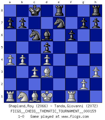 Last move : 1-0 2013 May 23 23:17:25 [Event "FICGS__CHESS__THEMATIC_TOURNAMENT__000159"] [Site "FICGS"] [Date "2013.02.23"] [Round "1"] [White "Shapland,Roy"] [Black "Tanda,Giovanni"] [Result "1-0"] [WhiteElo "2066"] [BlackElo "2072"] 1.e4 e5 2.f4 d5 3.exd5 c6 4.Qe2 cxd5 5.fxe5 Nc6 6.Nf3 Bg4 7.h3 Bxf3 8.Qxf3 Qe7 9.Qe3 Qxe5 10.Qxe5+ Nxe5 11.d4 Nc6 12.c3 O-O-O 13.Bd3 Re8+ 14.Kd1 Bd6 15.Rf1 f6 16.b4 Nge7 17.a4 1-0 This chess game has been lost on time (started : 2013.02.23 10:49:36) KGD : Nimzovich counter-gambit Queenside Castling by player Black (move 12) Player White won this chess game. Follow this game move after move (download)The stomach is an essential part of the Chess master. (Bent Larsen) Der 70jährige Viktor Kortschnoi: Die Rentenanstalt wollte mich zwingen in Rente zu gehen. Meine Frau erhält jetzt eine Pension- und ich zahle weiter in die Rentenkasse ein! (Viktor Kortschnoi) Siempre es mejor sacrificar los hombres de tu oponente. (Savielly Tartakower) Le plus grand jeu de l'esprit jamais inventé, plus vous l'apprenez, plus vous y prenez du plaisir. (Garry Kasparov) You can only get smarter by playing a smarter opponent. (Revolver, movie)
