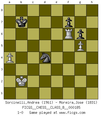 Last move : 1-0 2013 March 17 12:42:55 [Event "FICGS__CHESS__CLASS_B__000185"] [Site "FICGS"] [Date "2013.02.26"] [Round "1"] [White "Sorcinelli,Andrea"] [Black "Moreira,Jose"] [Result "1-0"] [WhiteElo "1961"] [BlackElo "1831"] 1.e4 c5 2.Nf3 d6 3.d4 cxd4 4.Nxd4 Nf6 5.Nc3 a6 6.f3 e5 7.Nb3 Be7 8.Be3 Be6 9.Qd2 Nbd7 10.g4 h6 11.O-O-O b5 12.h4 Nb6 13.Qf2 Nfd7 14.Kb1 Nc4 15.Bc1 Qb6 16.Qe1 Qc6 17.Bxc4 bxc4 18.Na5 Qc7 19.Nd5 Bxd5 20.exd5 c3 21.b4 Rb8 22.Nc6 Rb6 23.f4 a5 24.g5 hxg5 25.hxg5 Rxh1 26.Qxh1 Nb8 27.b5 Rxb5+ 28.Ka1 Rxd5 29.Qxd5 Nxc6 30.Qb5 Qd7 31.Rh1 exf4 32.Rh8+ Bf8 33.Bxf4 g6 34.a3 Ke7 35.Rg8 Qc7 36.Qc4 Qb6 37.Qxc3 Qd4 38.Qxd4 Nxd4 39.Bxd6+ Kxd6 40.Rxf8 Nxc2+ 41.Kb2 Ke7 42.Ra8 Nd4 43.Rxa5 Kd6 44.a4 Kc6 45.Ra6+ Kb7 46.Rf6 1-0 Sicilian : Najdorf Queenside Castling by player White (move 11) 10 pieces endgame at move 40 : White KRPPP , Black KNPPP WHITE : King + 1 Rook 3 Pawns BLACK : King + 1 Knight 3 Pawns 9 pieces endgame at move 40 : White KRPP , Black KNPPP WHITE : King + 1 Rook 2 Pawns BLACK : King + 1 Knight 3 Pawns 8 pieces endgame at move 43 : White KRPP , Black KNPP WHITE : King + 1 Rook 2 Pawns BLACK : King + 1 Knight 2 Pawns Player White won this chess game. Follow this game move after move (download)The blunders are all there on the board, waiting to be made. (Savielly Tartakover) Es hat in meinem Leben Zeiten gegeben, in denen das Schachspiel, wenn nicht zum Lebenszweck, so doch zu einem regelrechten Lebensersatz geworden ist. Man fühlt sich in solchen Zeiten nicht so, als besäße man eine göttliche Gabe, sondern eher so, als sei man von ihr besessen. (Garry Kasparov) El tablero es el mundo, las piezas es el fenomeno del universo, las reglas del juego son lo que llamamos leyes de la naturaleza y el jugador del lado opuesto, se encuentra oculto a nuestra vista. (Thomas Huxley) Dieu déplace le joueur, et celui-ci la pièce. Quel Dieu derrière Dieu commence donc la trame ? Arturo Perez-Reverte (prix de littérature policière 1993). The intuitive mind is a sacred gift; the rational mind is a faithful servant. We have created a society that honors the servant but has forgotten the gift. (Albert Einstein)