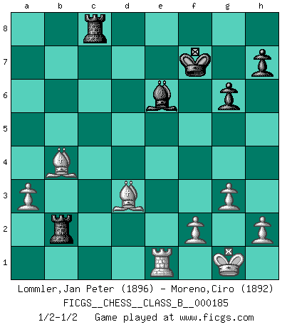 Last move : 1/2-1/2 2013 November 29 17:5:33 [Event "FICGS__CHESS__CLASS_B__000185"] [Site "FICGS"] [Date "2013.02.26"] [Round "1"] [White "Lommler,Jan Peter"] [Black "Moreno,Ciro"] [Result "1/2-1/2"] [WhiteElo "1896"] [BlackElo "1892"] 1.e4 c5 2.Nf3 Nc6 3.d4 cxd4 4.Nxd4 g6 5.Nc3 Bg7 6.Be3 d6 7.Be2 Nf6 8.O-O O-O 9.Re1 d5 10.exd5 Nxd5 11.Nxd5 Qxd5 12.Bf3 Qa5 13.c3 Nxd4 14.Bxd4 e5 15.Be3 Be6 16.Bxb7 Rab8 17.b4 Qc7 18.Ba6 Rfd8 19.Qc1 f5 20.Bc5 e4 21.Qe3 Qf7 22.Bxa7 Ra8 23.Bb6 Rd6 24.Bf1 f4 25.Qc5 Rd5 26.Qc7 Qxc7 27.Bxc7 Bxc3 28.Bc4 e3 29.Bxf4 Bxa1 30.Rxa1 e2 31.Bxe2 Rd4 32.Be5 Rxb4 33.a3 Rba4 34.Bd6 Rd4 35.Bc5 Rd2 36.Re1 Kf7 37.Bb4 Rb2 38.Bd3 Rc8 39.g3 1/2-1/2 Sicilian : Accelerated Fianchetto, Modern variation Kingside Castling by player White (move 8) Kingside Castling by player Black (move 8) This chess game ended in a draw. Follow this game move after move (download)You must take your opponent into a deep dark forest where 2+2=5, and the path leading out is only wide enough for one. (Mikhail Tal) Schach ist das Spiel, das die Verrückten gesund hält. (Albert Einstein) En partidas rápidas, el Caballo es mas poderoso que el Alfil. (Vlastimil Hort) Pour moi, les échecs ne sont pas un jeu mais un art. (Alexandre Alekhine) Good decisions come from experience, and experience comes from bad decisions. (Anonymous)