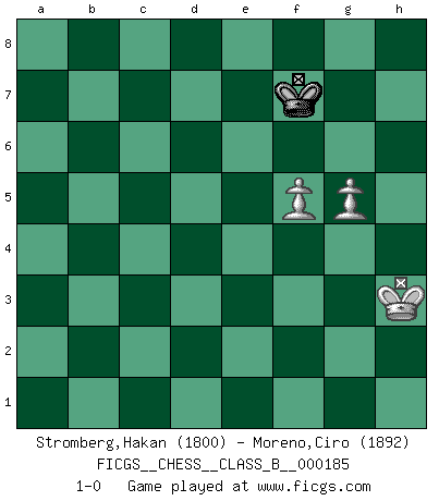 Last move : 1-0 2014 May 19 1:30:39 [Event "FICGS__CHESS__CLASS_B__000185"] [Site "FICGS"] [Date "2013.02.26"] [Round "1"] [White "Stromberg,Hakan"] [Black "Moreno,Ciro"] [Result "1-0"] [WhiteElo "1800"] [BlackElo "1892"] 1.e4 c5 2.Nf3 Nc6 3.d4 cxd4 4.Nxd4 e5 5.Nb5 d6 6.c4 Be6 7.Bd3 Nf6 8.N1c3 a6 9.Na3 Be7 10.Nd5 O-O 11.Be3 Nd7 12.Qd2 h6 13.Nxe7+ Qxe7 14.O-O Nc5 15.Rad1 Nxd3 16.Qxd3 Rad8 17.Bb6 Rd7 18.Nc2 f5 19.exf5 Bxf5 20.Qe2 Qg5 21.Ne3 Be6 22.Nd5 h5 23.Qd3 Bf5 24.Qg3 Qxg3 25.hxg3 Be6 26.Rfe1 Kf7 27.Nc3 Bxc4 28.b3 Be6 29.Ne4 Ke7 30.Nxd6 Kf6 31.Ne4+ Kg6 32.f3 Rd5 33.Nc5 Re8 34.Nxb7 Rb8 35.Nc5 Rxb6 36.Nxe6 Rxd1 37.Rxd1 Nb4 38.Nf8+ Kf5 39.Rd7 Nxa2 40.Rxg7 Rxb3 41.Rf7+ Kg5 42.Kh2 Nc1 43.Rc7 Nd3 44.Rc6 Rb7 45.Rd6 Nb4 46.Ng6 a5 47.Nxe5 a4 48.Nc4 Kf5 49.Rh6 Rc7 50.Nd6+ Ke5 51.Nb5 Rc4 52.Rxh5+ Ke6 53.g4 Kf6 54.Nd6 Rc6 55.Ne4+ Kg7 56.Rb5 Nc2 57.Rb7+ Kf8 58.Ra7 a3 59.Kg3 Re6 60.g5 Re7 61.Ra6 Rd7 62.Kf4 Kg7 63.Nf6 Rf7 64.Kg4 Ne3+ 65.Kh3 Rf8 66.Nh5+ Kg8 67.g6 Nd5 68.Rxa3 Nf4+ 69.Nxf4 Rxf4 70.Ra6 Kg7 71.Kg3 Rb4 72.f4 Rb5 73.Kg4 Kh6 74.f5 Rb2 75.g3 Rc2 76.Rf6 Rc4+ 77.Kh3 Rc7 78.Rf7 Rxf7 79.gxf7 Kg7 80.g4 Kxf7 81.g5 1-0 Sicilian : Labourdonnais-Loewenthal (Kalashnikov) variation Kingside Castling by player Black (move 10) Kingside Castling by player White (move 14) 10 pieces endgame at move 52 : White KRNPPP , Black KRNP WHITE : King + 1 Rook 1 Knight 3 Pawns BLACK : King + 1 Rook 1 Knight 1 Pawn 9 pieces endgame at move 68 : White KRNPPP , Black KRN WHITE : King + 1 Rook 1 Knight 3 Pawns BLACK : King + 1 Rook 1 Knight 8 pieces endgame at move 69 : White KRNPPP , Black KR WHITE : King + 1 Rook 1 Knight 3 Pawns BLACK : King + 1 Rook 7 pieces endgame at move 69 : White KRPPP , Black KR WHITE : King + 1 Rook 3 Pawns BLACK : King + 1 Rook 6 pieces endgame at move 78 : White KPPP , Black KR WHITE : King + 3 Pawns BLACK : King + 1 Rook 5 pieces endgame at move 79 : White KPPP , Black K WHITE : King + 3 Pawns BLACK : King + 4 pieces endgame at move 80 : White KPP , Black K WHITE : King + 2 Pawns BLACK : King + Player White won this chess game. Follow this game move after move (download)It is always better to sacrifice your opponent's men. (Savielly Tartakower) Meine Liebe ist Schach, Schach, Schach. Ich muss jeden Tag Schach spielen, deshalb fühle ich mich so stark. (Miguel Najdorf) Haz el enroque temprano y seguido. (Rob Sillars) On n'a jamais que l'âge auquel on a commence à jouer aux échecs car après on cesse de vieillir. (Capablanca) A journey of a thousand sites begins with a single click. (Author unknown)