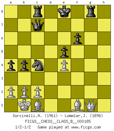 Last move : 1/2-1/2 2013 June 23 22:1:50 [Event "FICGS__CHESS__CLASS_B__000185"] [Site "FICGS"] [Date "2013.02.26"] [Round "1"] [White "Sorcinelli,Andrea"] [Black "Lommler,Jan Peter"] [Result "1/2-1/2"] [WhiteElo "1961"] [BlackElo "1896"] 1.e4 c5 2.Nf3 d6 3.d4 cxd4 4.Nxd4 Nf6 5.Nc3 a6 6.f3 e5 7.Nb3 Be6 8.Be3 Nbd7 9.Qd2 Be7 10.g4 h6 11.O-O-O b5 12.Kb1 Nb6 13.Qf2 Nfd7 14.h4 Nc4 15.Bc1 Qb6 16.Qe1 Rc8 17.Nd5 Qc6 18.Nxe7 Kxe7 19.Rh2 a5 20.Rg2 f6 21.f4 b4 22.g5 hxg5 23.fxe5 dxe5 24.hxg5 Ke8 25.gxf6 gxf6 26.Qf2 a4 27.Rxd7 Qxd7 28.Nc5 Qe7 29.Nxe6 Qxe6 30.Qa7 Qd7 31.Qg1 Qc7 32.Rg8+ Rxg8 1/2-1/2 Sicilian : Najdorf Queenside Castling by player White (move 11) This chess game ended in a draw. Follow this game move after move (download)The battle for the ultimate truth will never be won. And that's why Chess is so fascinating. (Hans Kmoch) Bobby Fischer ist kein Vorbild für die heutige Jugend. (Viktor Kortschnoi) Ciertamente el estado mental actual de Bobby Fischer es una tragedia. Uno de los mas grandes jugadores de Ajedrez del mundo -el orgullo y pena del Ajedrez Americano. (Frank Brady) Un millionnaire : 'Monsieur Steinitz ! Vous ne participez aux tournois que pour l'argent, alors que moi je n'y viens que pour l'honneur.' Steinitz : 'Chacun joue pour ce qu'il n'a pas'... There are two kinds of people in the world, my friend. Those who have a loaded gun and those who dig. You dig ! (Blondie in The Good, The Bad and The Ugly)