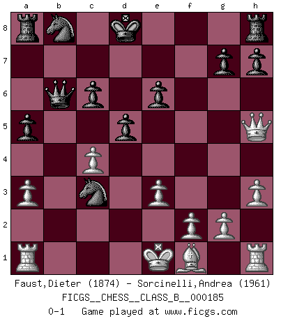 Last move : 0-1 2013 March 15 13:35:5 [Event "FICGS__CHESS__CLASS_B__000185"] [Site "FICGS"] [Date "2013.02.26"] [Round "1"] [White "Faust,Dieter"] [Black "Sorcinelli,Andrea"] [Result "0-1"] [WhiteElo "1874"] [BlackElo "1961"] 1.d4 d5 2.c4 c6 3.Nf3 Nf6 4.Nc3 a6 5.e3 b5 6.b3 Bg4 7.h3 Bxf3 8.Qxf3 e5 9.dxe5 Bb4 10.Bd2 Bxc3 11.Bxc3 Ne4 12.Bb4 bxc4 13.bxc4 Qb6 14.a3 a5 15.e6 fxe6 16.Qh5+ Kd8 17.Bc3 Nxc3 0-1 QGD Slav : 4.Nc3 Player Black won this chess game. Follow this game move after move (download)The chessboard is the world, the pieces are the phenomena of the Universe, the rules of the game are what we call the laws of Nature and the player on the other side is hidden from us. (Thomas Huxley) Wenn Dein Gegner dir ein Remis anbietet, versuch herauszufinden, weshalb er glaubt schlechter zu stehen. (Nigel Short) El Ajedrez es tan inspirador que yo no creo que un buen jugador sea capaz de tener un pensamiento malo durante una partida. (Wilhelm Steinitz) On a dit que l'homme se distingue de l'animal par le fait qu'il achète plus de livres qu'il ne peut en lire. Je voudrais suggérer qu'inclure à la liste des livres quelques livres d'échecs rendrait la distinction manifeste. (Edward Lasker) It's not the size of the dog in the fight, it's the size of the fight in the dog. (Mark Twain)