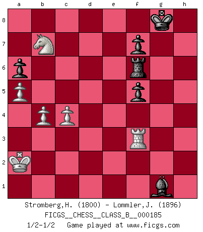 Last move : 1/2-1/2 2013 July 29 9:27:34 [Event "FICGS__CHESS__CLASS_B__000185"] [Site "FICGS"] [Date "2013.02.26"] [Round "1"] [White "Stromberg,Hakan"] [Black "Lommler,Jan Peter"] [Result "1/2-1/2"] [WhiteElo "1800"] [BlackElo "1896"] 1.e4 c5 2.Nf3 d6 3.d4 cxd4 4.Nxd4 Nf6 5.Nc3 a6 6.Be3 e5 7.Nde2 Be6 8.f4 Nbd7 9.f5 Bc4 10.Nc1 Bxf1 11.Rxf1 Rc8 12.Nb3 b5 13.a3 d5 14.Nxd5 Nxe4 15.Qf3 Nef6 16.O-O-O Nxd5 17.Rxd5 Qc7 18.Rd2 Be7 19.g4 h6 20.Kb1 Nf6 21.Re1 b4 22.a4 O-O 23.g5 hxg5 24.Bxg5 Ne4 25.Rxe4 Bxg5 26.Rg2 Rfd8 27.Rxb4 Qd6 28.c3 Bf4 29.Ka2 Qc6 30.Qg4 Bh6 31.Qe4 Bf4 32.Na5 Qxe4 33.Rxe4 Rd5 34.Rc4 Rdc5 35.Rxc5 Rxc5 36.Nb7 Rc6 37.a5 e4 38.Rg4 Bxh2 39.b4 g6 40.Rxe4 gxf5 41.Re3 Bg1 42.Rg3+ Rg6 43.Rf3 Rf6 44.c4 1/2-1/2 Sicilian : Najdorf, Byrne (English) attack Queenside Castling by player White (move 16) Kingside Castling by player Black (move 22) This chess game ended in a draw. Follow this game move after move (download)You know you're going to lose. Even when I was ahead I knew I was going to lose. - On playing against Fischer. (Andrew Soltis) Ja, ich habe einmal eine Blitzpartie gespielt, es war in einem Zug, 1929. --im Interview 1989 (Mikhail Moiseyevich Botvinik) Si tu oponente te ofrece un empate, trata de averiguar porque piensa él que esta en una posición peor. (Nigel Short) Les échecs sont un jeu terrible. Si vous n'avez pas le centre, votre adversaire a une position plus libre. Par contre, si vous avez le centre, alors vous avez vraiment quelque chose pour laquelle vous inquiéter ! (Siegbert Tarrasch) God is an atheist. (Unknown)