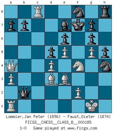 Last move : 1-0 2013 July 10 14:9:56 [Event "FICGS__CHESS__CLASS_B__000185"] [Site "FICGS"] [Date "2013.02.26"] [Round "1"] [White "Lommler,Jan Peter"] [Black "Faust,Dieter"] [Result "1-0"] [WhiteElo "1896"] [BlackElo "1874"] 1.e4 c6 2.d4 d5 3.e5 Bf5 4.Nc3 e6 5.g4 Bg6 6.Nf3 h5 7.g5 Ne7 8.Nh4 Nd7 9.a3 Nf5 10.Nxg6 fxg6 11.Ne2 Kf7 12.c3 c5 13.Nf4 cxd4 14.cxd4 Be7 15.h4 Qb6 16.Be3 Qxb2 17.Bd3 Rac8 18.O-O Nf8 19.Qa4 Nxh4 20.Rfb1 Qc3 21.Rc1 Qb2 22.Rxc8 1-0 Caro-Kann : Advance variation Kingside Castling by player White (move 18) Player White won this chess game. Follow this game move after move (download)Chess is played with the mind and not with the hands ! (Renaud and Kahn) Ich verstehe Aljechins Kombinationen ganz gut; aber woher er diese Angriffschancen bekommt und wie er die Eröffnung behandelt das ist für mich ein Buch mit sieben Siegeln. (Rudolf Spielmann) Observen a Garry Kasparov. Después de una derrota, invariablemente el gana la próxima partida. Prácticamente hace pedazos a su siguiente oponente. Eso es algo que tenemos que aprender a lograr. (Maurice Ashley) Le plus grand jeu de l'esprit jamais inventé, plus vous l'apprenez, plus vous y prenez du plaisir. (Garry Kasparov) If you are good, you will be assigned all the work. If you are really good, you will get out of it. (Dan Rotaru)