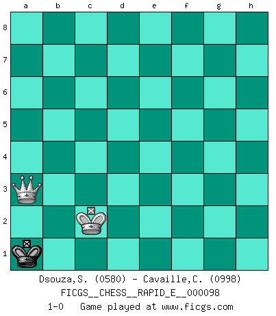 Last move : 1-0 2013 March 29 21:45:38 [Event "FICGS__CHESS__RAPID_E__000098"] [Site "FICGS"] [Date "2013.02.27"] [Round "1"] [White "Dsouza,Stanislaus"] [Black "Cavaille,Cedric"] [Result "1-0"] [WhiteElo "0580"] [BlackElo "0998"] 1.d4 d5 2.Nf3 Nc6 3.e3 Nf6 4.Bd3 e6 5.O-O Be7 6.Nc3 O-O 7.Bd2 a6 8.e4 dxe4 9.Nxe4 Nxd4 10.Nxd4 Qxd4 11.Bc3 Qd8 12.Nxf6+ Bxf6 13.Bxf6 Qxf6 14.c3 b5 15.Qh5 g6 16.Qc5 Qd8 17.Bc2 Qd6 18.Qxd6 cxd6 19.Rad1 d5 20.f4 Bb7 21.Rd4 Rac8 22.h4 f6 23.h5 Rc4 24.Rxc4 bxc4 25.hxg6 hxg6 26.Bxg6 Kg7 27.Bc2 a5 28.Kf2 e5 29.fxe5 fxe5 30.Kg1 Rxf1+ 31.Kxf1 e4 32.Kf2 Kf6 33.g4 Bc8 34.Kg3 Kg5 35.Bd1 e3 36.Be2 Kf6 37.Kf4 Kg6 38.Kxe3 Kg5 39.Kd4 Be6 40.b3 cxb3 41.axb3 Kf4 42.c4 dxc4 43.bxc4 a4 44.Kc3 a3 45.Kc2 Bxg4 46.Bxg4 a2 47.Kb2 a1Q+ 48.Kxa1 Kxg4 49.Kb2 Kf5 50.Kb3 Ke6 51.Kb4 Kd6 52.Kb5 Kc7 53.Kc5 Kb7 54.Kd6 Kc8 55.c5 Kd8 56.c6 Kc8 57.c7 Kb7 58.Kd7 Ka7 59.c8Q Kb6 60.Kd6 Kb5 61.Kd5 Kb4 62.Qc5+ Kb3 63.Kd4 Kb2 64.Qc3+ Kb1 65.Kd3 Ka2 66.Kd2 Kb1 67.Qb4+ Ka2 68.Kc2 Ka1 69.Qa3+ 1-0 Queen's pawn game, Chigorin variation Kingside Castling by player White (move 5) Kingside Castling by player Black (move 6) 10 pieces endgame at move 40 : White KBPPP , Black KBPPP WHITE : King + 1 Bishop 3 Pawns BLACK : King + 1 Bishop 3 Pawns 9 pieces endgame at move 41 : White KBPPP , Black KBPP WHITE : King + 1 Bishop 3 Pawns BLACK : King + 1 Bishop 2 Pawns 8 pieces endgame at move 42 : White KBPP , Black KBPP WHITE : King + 1 Bishop 2 Pawns BLACK : King + 1 Bishop 2 Pawns 7 pieces endgame at move 43 : White KBPP , Black KBP WHITE : King + 1 Bishop 2 Pawns BLACK : King + 1 Bishop 1 Pawn 6 pieces endgame at move 45 : White KBP , Black KBP WHITE : King + 1 Bishop 1 Pawn BLACK : King + 1 Bishop 1 Pawn 5 pieces endgame at move 46 : White KBP , Black KP WHITE : King + 1 Bishop 1 Pawn BLACK : King + 1 Pawn Promotion Queen by player Black (move 47) 4 pieces endgame at move 48 : White KBP , Black K WHITE : King + 1 Bishop 1 Pawn BLACK : King + 3 pieces endgame at move 48 : White KP , Black K WHITE : King + 1 Pawn BLACK : King + Promotion Queen by player White (move 59) Player White won this chess game. Follow this game move after move (download)Pawns: they are the soul of this game, they alone form the attack and defense. (Philidor) Immer nach dem besten Zug zu suchen ist ziemlich unpraktisch. (Nigel Short) El Ajedrez tiene tanto misterio como las mujeres. (Purdy) Les pièces de l'échiquier étaient impitoyables. Elles le retenaient, elles l'absorbaient. Il y avait de l'horreur en cela, mais aussi une harmonie unique. Car, qu'y a-t-il dans le monde, à part les échecs ? (V. Nabokov) Life doesn't imitate art, it imitates bad television. (Woody Allen)
