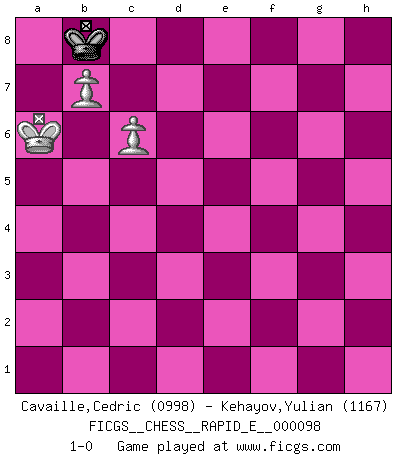 Last move : 1-0 2013 March 3 22:45:29 [Event "FICGS__CHESS__RAPID_E__000098"] [Site "FICGS"] [Date "2013.02.27"] [Round "1"] [White "Cavaille,Cedric"] [Black "Kehayov,Yulian"] [Result "1-0"] [WhiteElo "0998"] [BlackElo "1167"] 1.d4 d5 2.Nc3 Nf6 3.Nf3 Nc6 4.e3 e5 5.dxe5 Ng4 6.Nxd5 Ngxe5 7.Nxe5 Nxe5 8.e4 Be6 9.Bf4 Bd6 10.Be2 c6 11.Bxe5 Bxe5 12.Nc3 Bxc3+ 13.bxc3 Qxd1+ 14.Bxd1 O-O 15.O-O Rfe8 16.Be2 Bd7 17.Bd3 b5 18.Rfe1 Be6 19.a4 Bc4 20.Bxc4 bxc4 21.e5 Re6 22.f4 Rae8 23.Re4 f6 24.Rae1 g5 25.g3 h5 26.h4 gxh4 27.gxh4 fxe5 28.Rxe5 Rxe5 29.fxe5 Kf7 30.Re4 Re6 31.Rxc4 Rxe5 32.Rxc6 Ra5 33.Rc4 Ke6 34.Rd4 Ke5 35.Kf2 Ke6 36.Ke3 Ke5 37.Kd3 a6 38.Rb4 Kd5 39.c4+ Ke5 40.Ke3 Rc5 41.c3 Ra5 42.Kd3 Kd6 43.Rb6+ Kc5 44.Rh6 Rxa4 45.Rxh5+ Kb6 46.Rg5 Ra1 47.c5+ Kc6 48.Kd4 Rd1+ 49.Kc4 a5 50.Rg6+ Kc7 51.Ra6 Rh1 52.Rxa5 Rxh4+ 53.Kb5 Kb7 54.c4 Rh6 55.Kb4 Rb6+ 56.Rb5 Rxb5+ 57.cxb5 Ka7 58.Ka5 Kb7 59.b6 Kb8 60.Ka6 Ka8 61.b7+ Kb8 62.c6 1-0 Queen's pawn : Chigorin variation Kingside Castling by player Black (move 14) Kingside Castling by player White (move 15) 10 pieces endgame at move 32 : White KRPPPP , Black KRPP WHITE : King + 1 Rook 4 Pawns BLACK : King + 1 Rook 2 Pawns 9 pieces endgame at move 44 : White KRPPP , Black KRPP WHITE : King + 1 Rook 3 Pawns BLACK : King + 1 Rook 2 Pawns 8 pieces endgame at move 45 : White KRPPP , Black KRP WHITE : King + 1 Rook 3 Pawns BLACK : King + 1 Rook 1 Pawn 7 pieces endgame at move 52 : White KRPPP , Black KR WHITE : King + 1 Rook 3 Pawns BLACK : King + 1 Rook 6 pieces endgame at move 52 : White KRPP , Black KR WHITE : King + 1 Rook 2 Pawns BLACK : King + 1 Rook 5 pieces endgame at move 56 : White KPP , Black KR WHITE : King + 2 Pawns BLACK : King + 1 Rook 4 pieces endgame at move 57 : White KPP , Black K WHITE : King + 2 Pawns BLACK : King + Player White won this chess game. Follow this game move after move (download)Half the variations which are calculated in a tournament game turn out to be completely superfluous. Unfortunately, no one knows in advance which half. (Jan Tinman) Drei Punkte vor allen anderen ist wie einer, der im weißen Anzug posiert, während der Rest in Müllsäcke gekleidet dasteht. (Viktor Kortschnoi) En el Ajedrez, tal como es jugado por los Maestros, practicamente la suerte es eliminada. (Emanuel Lasker) Pour moi, les échecs ne sont pas un jeu mais un art. (Alexandre Alekhine) You think that education is too expensive ? Try ignorance. (Derek Bok)