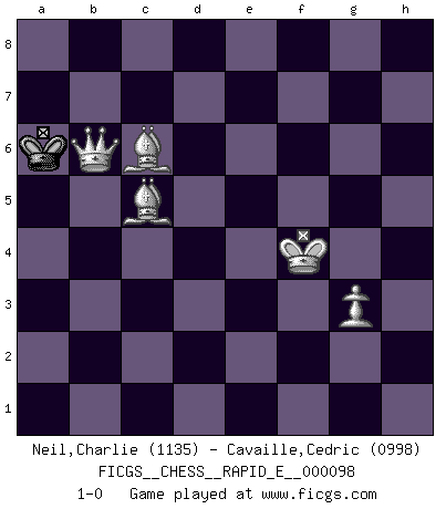 Last move : 1-0 2013 March 10 17:37:36 [Event "FICGS__CHESS__RAPID_E__000098"] [Site "FICGS"] [Date "2013.02.27"] [Round "1"] [White "Neil,Charlie"] [Black "Cavaille,Cedric"] [Result "1-0"] [WhiteElo "1135"] [BlackElo "0998"] 1.c4 c5 2.Nf3 d6 3.g3 Nf6 4.Bg2 e6 5.Nc3 Be7 6.O-O O-O 7.d4 cxd4 8.Nxd4 Bd7 9.e4 Nc6 10.Nxc6 Bxc6 11.Be3 a6 12.f4 b5 13.cxb5 Bxb5 14.Nxb5 axb5 15.e5 Ng4 16.Qxg4 d5 17.Bd4 b4 18.Rfc1 Ra5 19.Kh1 Qa8 20.Qe2 Rxa2 21.Rxa2 Qxa2 22.Qb5 g6 23.Qb7 Bd8 24.Qxb4 Qa5 25.Qxa5 Bxa5 26.Rc5 Bb6 27.b4 Bxc5 28.bxc5 Rb8 29.Bf1 Rb4 30.Bg1 Kf8 31.Ba6 Ra4 32.Bb7 Ra7 33.c6 Ra4 34.c7 Rc4 35.c8Q+ Rxc8 36.Bxc8 Ke7 37.Bc5+ Kd8 38.Ba6 Kd7 39.Bb5+ Kc7 40.Kg2 h6 41.Kf3 f5 42.exf6 g5 43.Kg4 d4 44.Bxd4 Kd6 45.Bc4 gxf4 46.Kxf4 h5 47.f7 e5+ 48.Bxe5+ Kc6 49.f8Q h4 50.Be6 hxg3 51.hxg3 Kb5 52.Bd5 Kb6 53.Bd6 Kb5 54.Qb8+ Ka6 55.Bc6 Ka5 56.Bc5 Ka6 57.Qb6+ 1-0 English : Symmetrical variation Kingside Castling by player White (move 6) Kingside Castling by player Black (move 6) Promotion Queen by player White (move 35) 10 pieces endgame at move 45 : White KBBPPP , Black KPPP WHITE : King + 2 Bishops 3 Pawns BLACK : King + 3 Pawns 9 pieces endgame at move 46 : White KBBPPP , Black KPP WHITE : King + 2 Bishops 3 Pawns BLACK : King + 2 Pawns 8 pieces endgame at move 48 : White KBBPPP , Black KP WHITE : King + 2 Bishops 3 Pawns BLACK : King + 1 Pawn Promotion Queen by player White (move 49) 7 pieces endgame at move 50 : White KQBBP , Black KP WHITE : King + 1 Queen 2 Bishops 1 Pawn BLACK : King + 1 Pawn 6 pieces endgame at move 51 : White KQBBP , Black K WHITE : King + 1 Queen 2 Bishops 1 Pawn BLACK : King + Player White won this chess game. Follow this game move after move (download)When you absolutely don't know what to do anymore, it is time to panic. (John van der Wiel) Später, ... hatte ich zunehmend Erfolg in entscheidenden Partien. Vielleicht weil ich eine einfache Wahrheit erkannte: nicht nur ich hatte Angst, auch mein Gegner. (Mikhail Nekhemyevich Tal) Sin errores no puede haber brillantez. (Emanuel Lasker) Il n'y a plus de joueurs du niveau de Jacob Murray dont la seule quête est le beau jeu, le plaisir de voir les pièces construire quelque chose. Sur 10 idées à la minute, 9 seront sans intérêt, la dernière s'avèrera géniale. (Christian Bauer) A specialist learns more and more about less and less until he knows everything about nothing. (Nicholas Murray Butler)