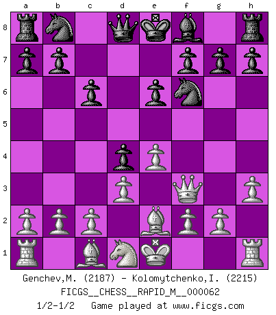 Last move : 1/2-1/2 2013 March 12 10:54:15 [Event "FICGS__CHESS__RAPID_M__000062"] [Site "FICGS"] [Date "2013.02.27"] [Round "1"] [White "Genchev,Maxim"] [Black "Kolomytchenko,Igor"] [Result "1/2-1/2"] [WhiteElo "2187"] [BlackElo "2215"] 1.e4 c6 2.Nc3 d5 3.Nf3 Bg4 4.h3 Bxf3 5.Qxf3 Nf6 6.d3 e6 7.Be2 d4 8.Nd1 1/2-1/2 Caro-Kann : Two knights, 3...Bg4 This chess game ended in a draw. Follow this game move after move (download)You may learn much more from a game you lose than from a game you win. You will have to lose hundreds of games before becoming a good player. (Jose Raul Capablanca) Mit sehr nachdenklichem Gesicht schreitet Bobby durch den Turniersaal. Was ist passiert?, fragt Lombardy. Ich stehe schlecht, antwortet Fischer. Lombardy: Dann biete doch einfach Remis an. Fischer: So schlecht stehe ich nun auch wieder nicht! (Robert James Fischer) Tu sabes que vas a perder. Aún cuando tenía la ventaja, yo sabía que iba a perder. - al estar jugando con Fischer (Andrew Soltis) Celui qui prend des risques peut perdre, celui qui n'en prend pas perd toujours. (Xavier Tartacover) If you are going through hell, keep going. (Winston Churchill)