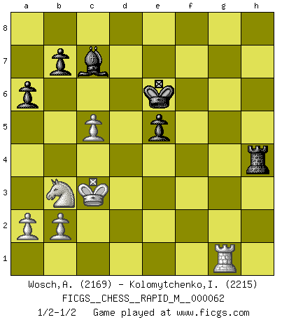 Last move : 1/2-1/2 2013 August 5 12:48:31 [Event "FICGS__CHESS__RAPID_M__000062"] [Site "FICGS"] [Date "2013.02.27"] [Round "1"] [White "Wosch,Arkadiusz"] [Black "Kolomytchenko,Igor"] [Result "1/2-1/2"] [WhiteElo "2169"] [BlackElo "2215"] 1.e4 c6 2.d4 d5 3.Nc3 dxe4 4.Nxe4 Bf5 5.Ng3 Bg6 6.h4 h6 7.Nf3 Nd7 8.h5 Bh7 9.Bd3 Bxd3 10.Qxd3 e6 11.Bf4 Qa5+ 12.Bd2 Qc7 13.O-O-O Ngf6 14.Ne4 Nxe4 15.Qxe4 Nf6 16.Qe2 Rd8 17.Kb1 a6 18.c3 c5 19.Bc1 cxd4 20.Nxd4 Bc5 21.Nb3 Bb6 22.Qf3 Rd5 23.Rxd5 Nxd5 24.Qg4 O-O 25.Bxh6 f5 26.Qg6 Qf7 27.Qxf7+ Kxf7 28.Bc1 Bxf2 29.Rf1 Bb6 30.g4 Kg8 31.gxf5 Rxf5 32.Re1 Kf7 33.h6 gxh6 34.Bxh6 e5 35.c4 Nf4 36.c5 Bc7 37.Rg1 Ke6 38.Bxf4 Rxf4 39.Kc2 Rf7 40.Kc3 Rh7 41.Kc4 Rh4+ 42.Kc3 Rh3+ 43.Kc4 Rh4+ 44.Kc3 1/2-1/2 Caro-Kann : Classical, 7...Nd7 Queenside Castling by player White (move 13) Kingside Castling by player Black (move 24) This chess game ended in a draw. Follow this game move after move (download)Your body has to be in top condition. Your Chess deteriorates as your body does. You can't separate body from mind. (Bobby Fischer) Konzentriere dich auf materielle Gewinne. Nimm, was dir dein Gegner gibt, ausser es gibt einen guten Grund der dagegenspricht. (Robert James Fischer) Estaba muy claro de que el punto vulnerable del Gran Maestro Americano (Bobby Fischer) radicaba en las posiciones de doble filo, colgantes, irracionales, donde el siempre falló en encontrar un triunfo aún en una posición de clara victoria. (Efim Geller) Votre prénom est 'Tactique', votre deuxième prénom est 'Tactique' et votre nom est 'Tactique'. (Ken Smith) The message for business people contemplating their place in the cyberspace is simple and direct: get linked or get lost. (Vic Sussman and Kenan Pollack)