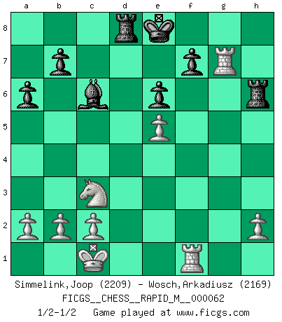 Last move : 1/2-1/2 2013 May 1 20:22:40 [Event "FICGS__CHESS__RAPID_M__000062"] [Site "FICGS"] [Date "2013.02.27"] [Round "1"] [White "Simmelink,Joop"] [Black "Wosch,Arkadiusz"] [Result "1/2-1/2"] [WhiteElo "2209"] [BlackElo "2169"] 1.e4 c5 2.Nf3 Nc6 3.d4 cxd4 4.Nxd4 Nf6 5.Nc3 d6 6.Bg5 e6 7.Qd2 a6 8.O-O-O Bd7 9.f3 Be7 10.g4 h5 11.gxh5 Nxh5 12.Be3 Ng3 13.Rg1 Nxf1 14.Rdxf1 Bf6 15.Nxc6 Bxc6 16.Bd4 Be5 17.f4 Bxd4 18.Qxd4 Qf6 19.e5 dxe5 20.fxe5 Rd8 21.Qe3 Qh6 22.Qxh6 Rxh6 23.Rxg7 1/2-1/2 Sicilian defense Queenside Castling by player White (move 8) This chess game ended in a draw. Follow this game move after move (download)All I want to do, ever, is just play Chess. (Bobby Fischer) Ohne ihre Erfolge schmälern zu wollen würde ich sagen Petrosian, Spassky und Karpov verdanken ihre Siege ihren Trainern - Boleslavsky, Bondarevsky und Furman. (Mikhail Moiseyevich Botvinik) El ganador de una partida es aquel jugador que hace el penúltimo error. (Savielly Tartakover) Aucun coup ne doit être joué sans but. (Pedro Damiano) The hypothalamus is one of the most important parts of the brain, involved in many kinds of motivation, among other functions. The hypothalamus controls the 'Four Fs: Fighting, Fleeing, Feeding and Mating. (Unknown author)