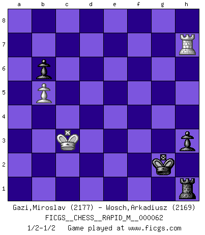 Last move : 1/2-1/2 2013 October 9 18:7:47 [Event "FICGS__CHESS__RAPID_M__000062"] [Site "FICGS"] [Date "2013.02.27"] [Round "1"] [White "Gazi,Miroslav"] [Black "Wosch,Arkadiusz"] [Result "1/2-1/2"] [WhiteElo "2177"] [BlackElo "2169"] 1.d4 Nf6 2.Bg5 Ne4 3.Bf4 c5 4.f3 Qa5+ 5.c3 Nf6 6.Nd2 cxd4 7.Nb3 Qb6 8.Qxd4 Nc6 9.Qxb6 axb6 10.Nd4 e5 11.Nxc6 exf4 12.Nd4 d5 13.g3 Bd6 14.Kf2 Bd7 15.Nh3 fxg3+ 16.hxg3 h5 17.e3 h4 18.g4 Bg3+ 19.Kg2 O-O-O 20.Ng1 Rde8 21.Nge2 Be5 22.g5 Ng8 23.Nf4 Ne7 24.Re1 f6 25.gxf6 Bxf6 26.Bb5 Bc6 27.a4 g5 28.Nd3 Rhf8 29.Rhg1 Rf7 30.Ref1 Ref8 31.Rf2 Kb8 32.Rgf1 Bxb5 33.Nxb5 Nc6 34.Rd2 Bh8 35.Rdf2 Re7 36.Re1 Rfe8 37.Nd6 Rf8 38.f4 g4 39.Rfe2 h3+ 40.Kh2 Re6 41.Nb5 Rg8 42.Nd4 Reg6 43.Kg3 Rh6 44.Nxc6+ bxc6 45.Ne5 Bxe5 46.fxe5 Re6 47.e4 Rxe5 48.exd5 Rxd5 49.Re8+ Rxe8 50.Rxe8+ Kb7 51.Kxg4 Rd2 52.b4 Rd3 53.b5 cxb5 54.axb5 Rxc3 55.Rh8 Rb3 56.Rh7+ Kc8 57.Rh5 Kc7 58.Kf4 Rb4+ 59.Ke3 Rb1 60.Kd4 Rh1 61.Kc3 Kd7 62.Rh7+ Ke6 63.Rh6+ Kf5 64.Rh8 Ke4 65.Re8+ Kf3 66.Rf8+ Kg3 67.Rg8+ Kf4 68.Rh8 Kg4 69.Rg8+ Kh4 70.Rh8+ Kg5 71.Rh7 Kg4 72.Rg7+ Kf3 73.Rh7 Kg2 1/2-1/2 Trompowsky attack (Ruth, Opovcensky Opening) Queenside Castling by player Black (move 19) 10 pieces endgame at move 51 : White KRPPP , Black KRPPP WHITE : King + 1 Rook 3 Pawns BLACK : King + 1 Rook 3 Pawns 9 pieces endgame at move 53 : White KRPP , Black KRPPP WHITE : King + 1 Rook 2 Pawns BLACK : King + 1 Rook 3 Pawns 8 pieces endgame at move 54 : White KRPP , Black KRPP WHITE : King + 1 Rook 2 Pawns BLACK : King + 1 Rook 2 Pawns 7 pieces endgame at move 54 : White KRP , Black KRPP WHITE : King + 1 Rook 1 Pawn BLACK : King + 1 Rook 2 Pawns This chess game ended in a draw. Follow this game move after move (download)Some sacrifices are sound; the rest are mine. (Mikhail Tal) Strategie ist, wie man ein Mädchen auf den Rücksitz bekommt. Taktik ist, was man tut, wenn man dann dort ist. (Anonymous) Cuando la partida de Ajedrez termina, el Peón y el Rey regresan a la misma caja. (Irish saying) RxDa4 pat (...) When you have everything, sometimes it feels like nothing. (Horatio Caine, C.S.I. Miami)
