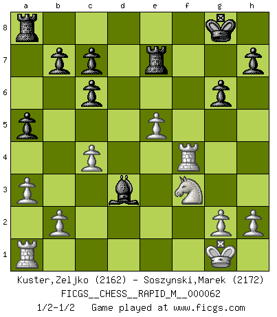 Last move : 1/2-1/2 2013 March 15 9:4:57 [Event "FICGS__CHESS__RAPID_M__000062"] [Site "FICGS"] [Date "2013.02.27"] [Round "1"] [White "Kuster,Zeljko"] [Black "Soszynski,Marek"] [Result "1/2-1/2"] [WhiteElo "2162"] [BlackElo "2172"] 1.c4 g6 2.e4 e5 3.d4 Nf6 4.Nf3 exd4 5.e5 Ne4 6.Qxd4 Bb4+ 7.Nbd2 Ng5 8.Be2 Nc6 9.Qe3 Nxf3+ 10.Bxf3 O-O 11.O-O Re8 12.Bxc6 dxc6 13.Nf3 Bg4 14.Bd2 a5 15.a3 Bxd2 16.Nxd2 f6 17.f4 fxe5 18.fxe5 Bf5 19.Rf4 Qd3 20.Qxd3 Bxd3 21.Nf3 Re7 1/2-1/2 English : Adorjan defense Kingside Castling by player Black (move 10) Kingside Castling by player White (move 11) This chess game ended in a draw. Follow this game move after move (download)The King is a fighting piece. Use it ! (Wilhelm Steinitz) Es ist besser die Steine des Gegners zu opfern. (Savielly Grigorievitsch Tartakower) Dejen al perfeccionista jugar por correo. (Yasser Seirawan) Le profane ne songe pas à la somme de jouissance dont il se prive, qui méconnaît ce jeu aux ressources aussi variées que passionnantes. (Jean-Marie Jeanton-Lamarche) Man is reluctant to give credit for intelligence to anyone, except his enemies. (Albert Einstein)