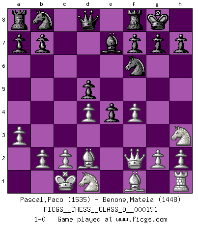 Last move : 1-0 2013 July 27 4:15:36 [Event "FICGS__CHESS__CLASS_D__000191"] [Site "FICGS"] [Date "2013.02.28"] [Round "1"] [White "Pascal,Paco"] [Black "Benone,Mateia"] [Result "1-0"] [WhiteElo "1535"] [BlackElo "1448"] 1.e3 e5 2.d4 e4 3.Nc3 d5 4.f4 Nf6 5.Nh3 Bb4 6.Bd2 O-O 7.a3 Be7 8.Qe2 c5 9.O-O-O cxd4 10.exd4 Bg4 11.Qf2 Bxd1 12.Nxd1 1-0 This chess game has been lost on time (started : 2013.02.28 8:16:15) Van't Kruijs Opening Kingside Castling by player Black (move 6) Queenside Castling by player White (move 9) Player White won this chess game. Follow this game move after move (download)We don't really know how the game was invented, though there are suspicions. As soon as we discover the culprits, we'll let you know. (Bruce Pandolfini) Die jungen Leute sollen verstehen, dass sie noch etwas von mir lernen können und müssen. (Viktor Kortschnoi) Estaba muy claro de que el punto vulnerable del Gran Maestro Americano (Bobby Fischer) radicaba en las posiciones de doble filo, colgantes, irracionales, donde el siempre falló en encontrar un triunfo aún en una posición de clara victoria. (Efim Geller) Il vaut toujours mieux jouer un plan faux de façon logique que de n'avoir pas de plan du tout. (Victor Kortchnoï) The absolute truth is the thing that makes people laugh. (Carl Reiner)