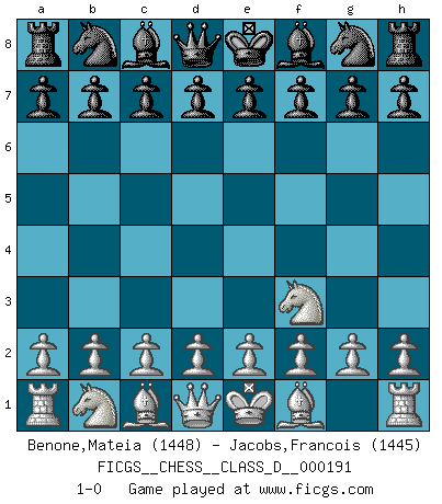 Last move : 1-0 2013 April 27 21:26:12 [Event "FICGS__CHESS__CLASS_D__000191"] [Site "FICGS"] [Date "2013.02.28"] [Round "1"] [White "Benone,Mateia"] [Black "Jacobs,Francois"] [Result "1-0"] [WhiteElo "1448"] [BlackElo "1445"] 1.Nf3 1-0 This chess game has been lost on time (started : 2013.02.28 8:16:15) Reti Opening Player White won this chess game. Follow this game move after move (download)Man is a frivolous, a specious creature, and like a Chess player, cares more for the process of attaining his goal than for the goal itself. (Dostoyevsky) Es ist wirklich schade, dass so viele Schachspieler nicht auf ihr Äußeres achten! (Alexandra Kosteniuk) Alguna parte de un error es siempre correcto. (Savielly Tartakover) À la honte des hommes, on sait que les lois du jeu sont les seules qui soient partout justes, claires, inviolables et exécutées. Pourquoi l'Indien qui a donné les règles du jeu d'échecs est-il obéi de bon gré dans toute la terre, et que les décrétales des papes, par exemple, sont aujourd'hui un objet d'horreur et de mépris ? C'est que l'inventeur des échecs combina tout avec justesse pour la satisfaction des joueurs, et que les papes, dans leurs décrétales, n'eurent en vue que leur seul avantage. L'Indien voulut exercer également l'esprit des hommes et leur donner du plaisir; les papes ont voulu abrutir l'esprit des hommes. Voltaire (Dictionnaire philosophique / Garnier 1967) If things go wrong, don't go with them. (Roger Babson)