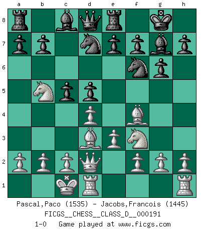 Last move : 1-0 2013 April 11 20:52:12 [Event "FICGS__CHESS__CLASS_D__000191"] [Site "FICGS"] [Date "2013.02.28"] [Round "1"] [White "Pascal,Paco"] [Black "Jacobs,Francois"] [Result "1-0"] [WhiteElo "1535"] [BlackElo "1445"] 1.Nc3 d5 2.d4 Nf6 3.Bf4 g6 4.e3 Bg7 5.Nf3 O-O 6.Bd3 Nbd7 7.Qd2 Re8 8.O-O-O c5 9.Nb5 1-0 This chess game has been lost on time (started : 2013.02.28 8:16:15) Dunst (Sleipner, Heinrichsen) Opening Kingside Castling by player Black (move 5) Queenside Castling by player White (move 8) Player White won this chess game. Follow this game move after move (download)The hardest game to win is a won game. (Emanuel Lasker) Es tut gut, die Entwicklungsperiode von, [...] demokratischem Geist durchdringen zu lassen. Wie undemokratisch wäre es doch beispielsweise, den einen Offizier große Spaziertouren vornehmen zu lassen, während die anderen zu Hause säßen und sich entsetzlich langweilten. (Aaron Nimzowitsch) El Ajedrez moderno está demasiado preocupado con cosas como la estructura de Peones. Olvidenlo, el Jaque Mate termina la partida. (Nigel Short) Que feriez-vous si vous étiez en train de jouer aux échecs et que la fin du monde arrive ? Je continuerais à jouer. (Saint Borromée) To steal ideas from one person is plagiarism. To steal from many is research. (Unknown)