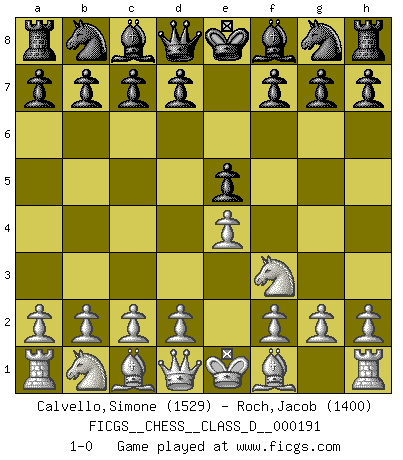 Last move : 1-0 2013 April 9 20:46:20 [Event "FICGS__CHESS__CLASS_D__000191"] [Site "FICGS"] [Date "2013.02.28"] [Round "1"] [White "Calvello,Simone"] [Black "Roch,Jacob"] [Result "1-0"] [WhiteElo "1529"] [BlackElo "1400"] 1.e4 e5 2.Nf3 1-0 This chess game has been lost on time (started : 2013.02.28 8:16:15) King's knight Opening Player White won this chess game. Follow this game move after move (download)First-class players lose to second class players because second-class players sometimes play a first-class game. (Tarrasch) Der Schachmeister von Heute braucht Courage, einen Killerinstinkt, Ausdauer und Arroganz. (Larry Evans) El Ajedrez es un terrible juego. Si no controlas el centro, tu oponente tiene una posición mas holgada. Si tienes control del centro, ¡entonces realmente tu tienes algo de que preocuparte!. (Siegbert Tarrasch) Il a essayé de se convaincre qu'il pourrait empêcher toutes les erreurs et ne jamais perdre. L'horreur ! Gary Kasparov au sujet de Robert Fischer. Wisdom is the reward you get for a lifetime of listening when you'd have preferred to talk. (Doug Larson)
