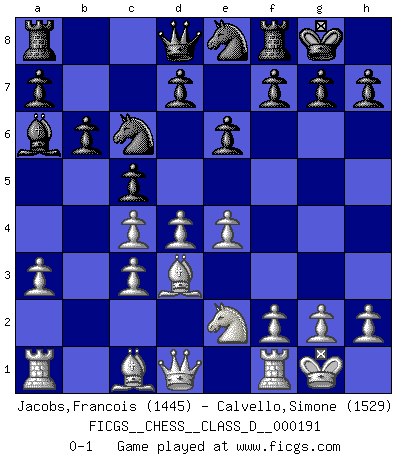 Last move : 0-1 2013 May 7 22:5:54 [Event "FICGS__CHESS__CLASS_D__000191"] [Site "FICGS"] [Date "2013.02.28"] [Round "1"] [White "Jacobs,Francois"] [Black "Calvello,Simone"] [Result "0-1"] [WhiteElo "1445"] [BlackElo "1529"] 1.d4 Nf6 2.c4 e6 3.Nc3 Bb4 4.a3 Bxc3+ 5.bxc3 c5 6.e3 Nc6 7.Bd3 O-O 8.Ne2 b6 9.e4 Ne8 10.O-O Ba6 0-1 Nimzo-Indian : Saemisch variation Kingside Castling by player Black (move 7) Kingside Castling by player White (move 10) Player Black won this chess game. Follow this game move after move (download)With or without the title, Bobby Fischer was unquestionably the greatest player of his time. (Burt Hochberg) Ich verachte die Medien. (Robert James Fischer) Mis oponentes también hacen buenas movidas. A veces yo no tomo esas cosas en consideración. (Bobby Fischer) La guerre est enfant de la passion, la passion est enfant du narcissisme et le narcissisme est l'enfant. (...) Une autre partie ? (Thibault de Vassal) There's no money in correspondence chess. (John Knudsen)