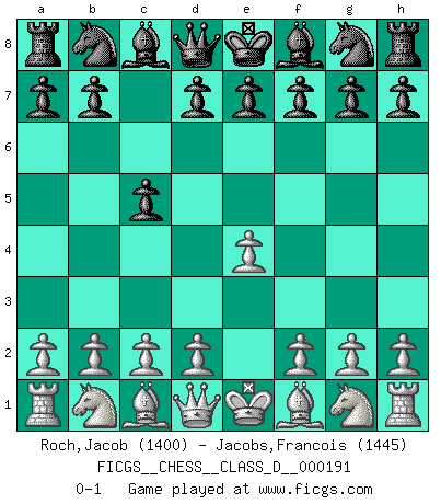 Last move : 0-1 2013 April 10 8:45:46 [Event "FICGS__CHESS__CLASS_D__000191"] [Site "FICGS"] [Date "2013.02.28"] [Round "1"] [White "Roch,Jacob"] [Black "Jacobs,Francois"] [Result "0-1"] [WhiteElo "1400"] [BlackElo "1445"] 1.e4 c5 0-1 This chess game has been lost on time (started : 2013.02.28 8:16:15) Sicilian defense Player Black won this chess game. Follow this game move after move (download)I don't believe in psychology. I believe in good moves. (Bobby Fischer) Schachspieler können ausgezeichnet Varianten am Schachbrett berechnen, aber nicht im realen Leben. Zu stark ist der Individualismus im Schach ausgeprägt, und für viele ist ein kleiner momentaner persönlicher Vorteil wichtiger als ein weit größerer Vorteil von morgen. (Anatoly Karpov) Una mala movida nulifica cuarenta buenas. (Horowitz) Seul un grand joueur sait à quel point il joue faiblement. (Xavier Tartacover) No enterprise is more likely to succeed than one concealed from the enemy until it is ripe for execution. (Niccolo Machiavelli)