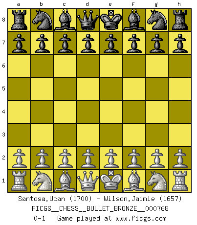Last move : 0-1 2013 February 28 16:30:0 [Event "FICGS__CHESS__BULLET_BRONZE__000768"] [Site "FICGS"] [Date "2013.02.28"] [Round "1"] [White "Santosa,Ucan"] [Black "Wilson,Jaimie"] [Result "0-1"] [WhiteElo "1700"] [BlackElo "1657"] 0-1 This chess game has been lost on time (started : 2013.02.28 14:28:50) Player Black won this chess game. Follow this game move after move (download)The most important feature of the Chess position is the activity of the pieces. This is absolutely fundamental in all phases of the game: Opening, Middlegame and especially Endgame. The primary constraint on a piece's activity is the Pawn structure. (Michael Stean) Kleine Schachspieler machen Mist, und große Schachspieler machen Mist, aber große machen weniger Mist. (Fritz Sämisch) No hay un Gran Maestro de Ajedrez que sea normal; solo se diferencían ellos por la magnitud de su locura. (Viktor Korchnoi) Il vaut toujours mieux jouer un plan faux de façon logique que de n'avoir pas de plan du tout. (Victor Kortchnoï) Mac users swear by their computers. PC users swear at their computers. (Author unknown)