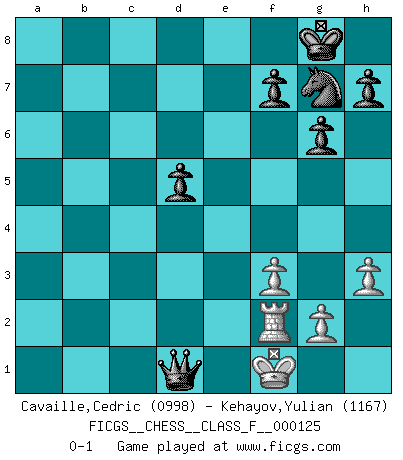 Last move : 0-1 2013 March 3 23:3:24 [Event "FICGS__CHESS__CLASS_F__000125"] [Site "FICGS"] [Date "2013.03.01"] [Round "1"] [White "Cavaille,Cedric"] [Black "Kehayov,Yulian"] [Result "0-1"] [WhiteElo "0998"] [BlackElo "1167"] 1.d4 g6 2.c4 Bg7 3.Nf3 d5 4.e3 c6 5.Nc3 Nf6 6.Bd3 O-O 7.O-O a6 8.a3 b5 9.cxb5 axb5 10.b4 Re8 11.Bb2 Nbd7 12.a4 bxa4 13.Rxa4 Rxa4 14.Nxa4 e5 15.b5 exd4 16.bxc6 Ne5 17.Nxe5 Rxe5 18.Bxd4 Re6 19.Nb6 Rxc6 20.Nxc8 Qxc8 21.f3 Nh5 22.Bxg7 Nxg7 23.Rf2 Rc1 24.Qxc1 Qxc1+ 25.Rf1 Qxe3+ 26.Rf2 Qxd3 27.h3 Qe3 28.Kf1 Qc1+ 29.Ke2 Qc2+ 30.Kf1 Qd1+ 0-1 Modern defense Kingside Castling by player Black (move 6) Kingside Castling by player White (move 7) Player Black won this chess game. Follow this game move after move (download)One of these modest little moves may be more embarrassing to your opponent than the biggest threat. (Siegbert Tarrasch) Ein guter Spieler hat immer Glück. (José Raúl Capablanca) Me dio la sensación de como si yo estuviera jugando en contra del mismo Ajedrez. - al estar jugando en contra de Robert Fischer (Walter Shipman) À la honte des hommes, on sait que les lois du jeu sont les seules qui soient partout justes, claires, inviolables et exécutées. Pourquoi l'Indien qui a donné les règles du jeu d'échecs est-il obéi de bon gré dans toute la terre, et que les décrétales des papes, par exemple, sont aujourd'hui un objet d'horreur et de mépris ? C'est que l'inventeur des échecs combina tout avec justesse pour la satisfaction des joueurs, et que les papes, dans leurs décrétales, n'eurent en vue que leur seul avantage. L'Indien voulut exercer également l'esprit des hommes et leur donner du plaisir; les papes ont voulu abrutir l'esprit des hommes. Voltaire (Dictionnaire philosophique / Garnier 1967) . 'gn is not allowed in chess unless n is an integer between 1 and 8 inclusive, where 1 and 8 are to interpreted as the standard numerals standing for integers in the ordered real-closed field R, with the *canonical* ordering. (As opposed to, say, an integer in the domain Z[2+i*sqrt(5)] or an integer in some exotic Grothendieck topos). (Normajean Yates)
