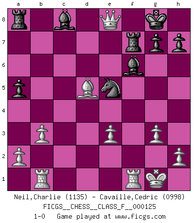 Last move : 1-0 2013 March 5 21:31:54 [Event "FICGS__CHESS__CLASS_F__000125"] [Site "FICGS"] [Date "2013.03.01"] [Round "1"] [White "Neil,Charlie"] [Black "Cavaille,Cedric"] [Result "1-0"] [WhiteElo "1135"] [BlackElo "0998"] 1.e4 c5 2.Nc3 d6 3.Nge2 Nf6 4.g3 e6 5.Bg2 Be7 6.d4 cxd4 7.Nxd4 a6 8.O-O O-O 9.Be3 b5 10.e5 b4 11.Nce2 d5 12.exf6 Bxf6 13.c3 bxc3 14.Nxc3 Qb6 15.Rb1 Nc6 16.Nxe6 Qxe3 17.fxe3 fxe6 18.Qa4 Ne5 19.b3 a5 20.Nxd5 exd5 21.Bxd5+ Rf7 22.Qe8+ 1-0 Sicilian : Closed Kingside Castling by player White (move 8) Kingside Castling by player Black (move 8) Player White won this chess game. Follow this game move after move (download)Life is a kind of Chess, with struggle, competition, good and ill events. (Benjamin Franklin) Je älter ich werde, um so mehr schätze ich die Bauern. (Paul Keres) Una de estas pequeñas movidas modestas pudieran ser mas molestas a tu oponente que la amenaza mas grande. (Siegbert Tarrasch) Ce n'est pas pour s'amuser qu'il joue aux échecs : il célèbre un culte. (Vladimir Nabokov) I couldn't make any sense out of what this particular thread is about. It sounds like R2 D2 computer speaking. A space fight ?!? Some 'command' problems in Moscow ? Some killers & narcotic addicts attacking some game & a god wannabe ?? (Dinesh De Silva, lost in a russian conflict in FICGS forum)