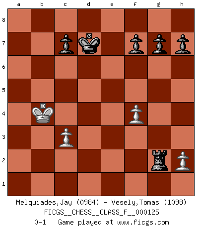 Last move : 0-1 2013 March 18 16:12:15 [Event "FICGS__CHESS__CLASS_F__000125"] [Site "FICGS"] [Date "2013.03.01"] [Round "1"] [White "Melquiades,Jay"] [Black "Vesely,Tomas"] [Result "0-1"] [WhiteElo "0984"] [BlackElo "1098"] 1.e4 e5 2.Nf3 Nf6 3.a3 Nc6 4.c3 d5 5.Bb5 Qd6 6.d3 dxe4 7.dxe4 Qxd1+ 8.Kxd1 Bd7 9.Bg5 Nxe4 10.Be3 O-O-O 11.Nbd2 Bf5 12.Nxe5 Nxe5 13.Ke2 Nxd2 14.Rad1 Ndc4 15.Bxc4 Nxc4 16.Rxd8+ Kxd8 17.Rd1+ Kc8 18.Bxa7 Nxb2 19.Rd2 Bxa3 20.Rd5 Be6 21.Ra5 Nc4 22.Ra4 Bd6 23.Bd4 Kd7 24.Ra7 Be5 25.Bxe5 Nxe5 26.Rxb7 Bc4+ 27.Kd2 Re8 28.Rb4 Ra8 29.f4 Ra2+ 30.Ke3 Re2+ 31.Kd4 Nc6+ 32.Kxc4 Nxb4 33.Kxb4 Rxg2 0-1 Petrov's defense Queenside Castling by player Black (move 10) 10 pieces endgame at move 33 : White KPPP , Black KRPPPP WHITE : King + 3 Pawns BLACK : King + 1 Rook 4 Pawns Player Black won this chess game. Follow this game move after move (download)The older I grow, the more I value Pawns. (Keres) Ich verstehe mehr vom Schach als irgendein anderer lebender Meister. (José Raúl Capablanca) Mis oponentes también hacen buenas movidas. A veces yo no tomo esas cosas en consideración. (Bobby Fischer) Vous n'êtes pas toujours obligé de jouer le meilleur coup. Un coup doit être actif, entreprenant, correct et beau ! (David Bronstein) Either move or be moved. (Ezra Pound)