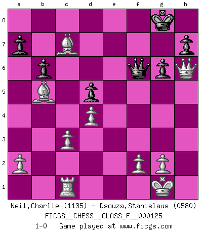 Last move : 1-0 2013 March 23 12:2:23 [Event "FICGS__CHESS__CLASS_F__000125"] [Site "FICGS"] [Date "2013.03.01"] [Round "1"] [White "Neil,Charlie"] [Black "Dsouza,Stanislaus"] [Result "1-0"] [WhiteElo "1135"] [BlackElo "0580"] 1.d4 d5 2.c4 c6 3.Nc3 e6 4.Nf3 Bb4 5.e3 Nf6 6.Bd3 Bxc3+ 7.bxc3 O-O 8.cxd5 exd5 9.O-O Be6 10.Re1 Nbd7 11.Qc2 g6 12.Rb1 b6 13.h4 Bg4 14.Ng5 Qe7 15.Bd2 Be6 16.e4 Ng4 17.exd5 cxd5 18.Nf3 Rfc8 19.h5 Qd6 20.hxg6 fxg6 21.Bg5 Rc6 22.Qd2 Rac8 23.Rbc1 Ndf6 24.Ne5 Nd7 25.Nxc6 Rxc6 26.Bf4 Qf8 27.Bg3 Nh6 28.Bb5 Rc8 29.Rxe6 Rc7 30.Bxc7 Nf6 31.Rxf6 Qxf6 32.Qxh6 1-0 QGD Slav defense Kingside Castling by player Black (move 7) Kingside Castling by player White (move 9) Player White won this chess game. Follow this game move after move (download)In complicated positions, Bobby Fischer hardly had to be afraid of anybody. (Paul Keres) Fischer ist das größte Genie, das je vom Schachhimmel heruntergestiegen ist. (Mikhail Nekhemyevich Tal) El Peón aislado arroja penumbra sobre todo el tablero. (Aaron Nimzovich) Aux échecs, les retours au sommet sont rares : les dommages psychologiques consécutifs à une défaite sont trop sévères. (Daily Telegraph) The difference between stupidity and genius is that genius has its limits. (Murphy)