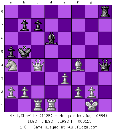 Last move : 1-0 2013 March 11 17:17:21 [Event "FICGS__CHESS__CLASS_F__000125"] [Site "FICGS"] [Date "2013.03.01"] [Round "1"] [White "Neil,Charlie"] [Black "Melquiades,Jay"] [Result "1-0"] [WhiteElo "1135"] [BlackElo "0984"] 1.c4 d5 2.Nf3 f6 3.Nc3 e6 4.d4 a6 5.cxd5 exd5 6.Bf4 Bb4 7.e3 Nc6 8.Bd3 a5 9.O-O Bg4 10.h3 Nge7 11.hxg4 h5 12.gxh5 Rxh5 13.Ne5 Nxe5 14.Qxh5+ Kd7 15.dxe5 fxe5 16.Qxe5 Bd6 17.Bf5+ Ke8 18.Qxg7 Nxf5 19.Qg6+ Kd7 20.Qxf5+ Kc6 21.Qxd5+ Kd7 22.Rfd1 Qh4 23.Qf7+ Kc6 24.Rac1 Rh8 25.Na4 Kb5 26.Qc4+ 1-0 English Opening Kingside Castling by player White (move 9) Player White won this chess game. Follow this game move after move (download)I have always a slight feeling of pity for the man who has no knowledge of Chess. (Siegbert Tarrasch) Das ganze Leben mit einer Ehefrau ist wie ein Endspiel mit ungleichfarbigen Läufern. (Viktor Kortschnoi) Uno no tiene que jugar muy bien, es suficiente jugar mejor que el oponente. (Siegbert Tarrasch) Un footballeur joue avec ses pieds, parfois avec sa tête. Un joueur d'échecs ne joue qu'avec sa tête. Et quand il ne joue plus, il meurt. (Jacob Murray) Kids, you tried your best and you failed miserably. The lesson is, never try. (Simpsons)
