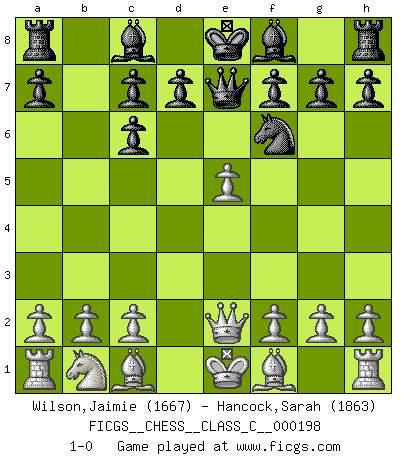 Last move : 1-0 2013 April 30 9:39:47 [Event "FICGS__CHESS__CLASS_C__000198"] [Site "FICGS"] [Date "2013.03.01"] [Round "1"] [White "Wilson,Jaimie"] [Black "Hancock,Sarah"] [Result "1-0"] [WhiteElo "1667"] [BlackElo "1863"] 1.e4 e5 2.Nf3 Nc6 3.d4 exd4 4.Nxd4 Nf6 5.Nxc6 bxc6 6.e5 Qe7 7.Qe2 1-0 This chess game has been lost on time (started : 2013.03.01 13:52:21) Scotch : Mieses variation Player White won this chess game. Follow this game move after move (download)Chess is like life. (Boris Spassky) Als er Schachweltmeister wurde ließ er praktisch alle stärksten Sovietspieler für sich arbeiten. Wenn ein auch nur mittelmässiger Meister ein Spezialist für eine bestimmte Eröffnung war, wurde er von Karpov gerufen. Das wurde alles geheim gehalten. (Mikhail Moiseyevich Botvinik) El Ajedrez es un expediente tonto que hace creer a la gente inactiva que hacen una cosa muy astuta cuando solamente estan perdiendo su tiempo. (George Bernard Shaw) On entre au jeu d'Echecs comme on entre en Religion. Pour le joueur d'Echecs, la partie d'Echecs c'est l'office, la messe, le défilé du 1er Mai, le dépôt de gerbe au Monument aux Morts. C'est un drame sacré. (Michel Roos) The problem with troubleshooting is that trouble shoots back. (Anonymous)