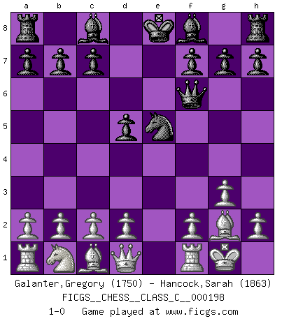 Last move : 1-0 2013 May 1 21:44:59 [Event "FICGS__CHESS__CLASS_C__000198"] [Site "FICGS"] [Date "2013.03.01"] [Round "1"] [White "Galanter,Gregory"] [Black "Hancock,Sarah"] [Result "1-0"] [WhiteElo "1750"] [BlackElo "1863"] 1.e4 e5 2.Nf3 Nc6 3.g3 Nf6 4.Bg2 Nxe4 5.Nxe5 Nxe5 6.Bxe4 d5 7.Bg2 Qf6 8.O-O 1-0 This chess game has been lost on time (started : 2013.03.01 13:52:21) Konstantinopolsky Opening Kingside Castling by player White (move 8) Player White won this chess game. Follow this game move after move (download)A strong memory, concentration, imagination, and a strong will is required to become a great Chess player. (Bobby Fischer) Den Ruhm habe ich schon, jetzt brauche ich noch das Geld. (Wilhelm Steinitz) Solo existe una cosa que Fischer hace en el Ajedrez sin placer: ¡perder!. (Boris Spassky) La conception d'un plan est le processus par lequel un joueur exploite les avantages de sa position tout en s'efforçant d'en réduire au minimum les inconvénients. Afin de garantir le succès, un plan doit toujours se fonder sur un diagnostic objectif des particularités d'une position. La conception d'un plan est d'autant plus difficile que la position est équilibrée, et grandement facilitée lorsqu'il n'existe qu'un seul plan susceptible de répondre aux exigences de la position. (Harry Golombek) The question of whether computers can think is just like question of whether submarines can swim. (Edsger W. Dijkstra)